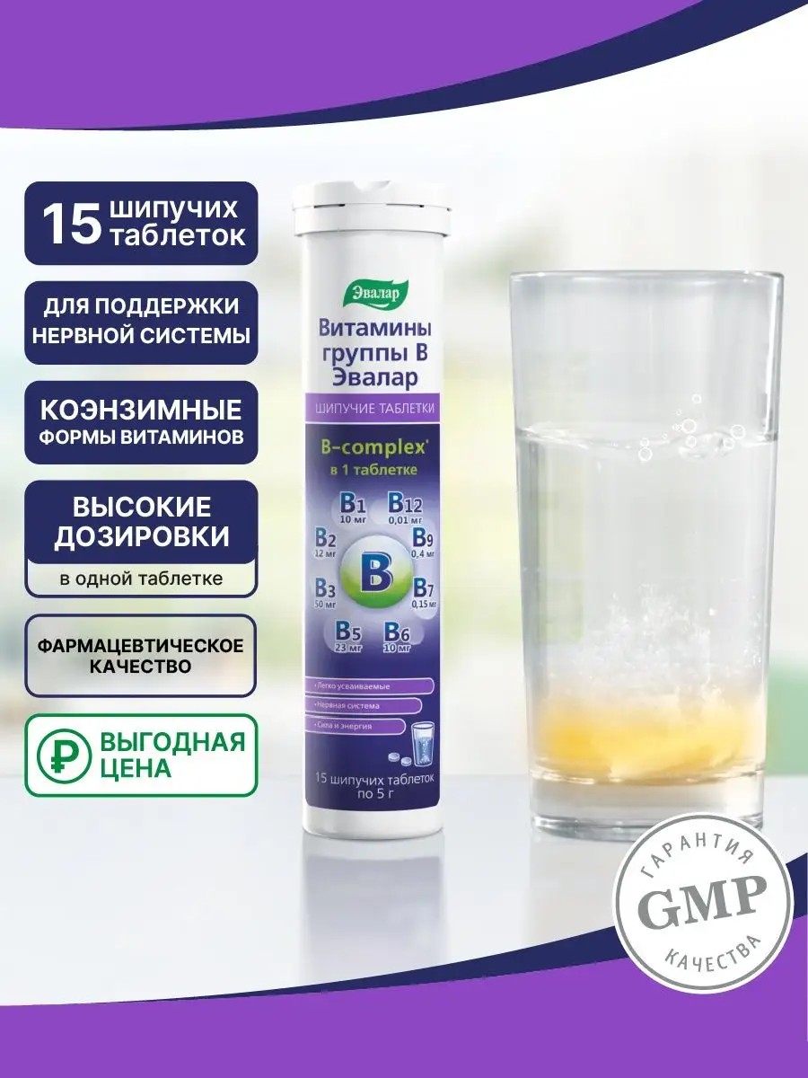 The company "Evalar" presents a new development - B vitamins in the easily accessible form of effervescent tablets. B vitamins from "Evalar" in the form of effervescent tablets contain new easily digestible forms of B vitamins and help: - improve the functional state of the central and peripheral nervous system; - restore damaged nerve fibers and reduce pain; - restore strength and energy; - improve memory; - improve the condition of the skin, hair and nails. - The modern B-complex is enhanced with vitamin C and zinc. Directions for use: Dissolve ½ tablet in 1 glass of water (200 ml) at room temperature. Adults take 1 glass of the drink per day. Duration of use is at least 1 month. In conditions accompanied by an increased need for B vitamins - as recommended by a doctor. If necessary, the course of treatment can be repeated. It is recommended to consult a doctor before use.