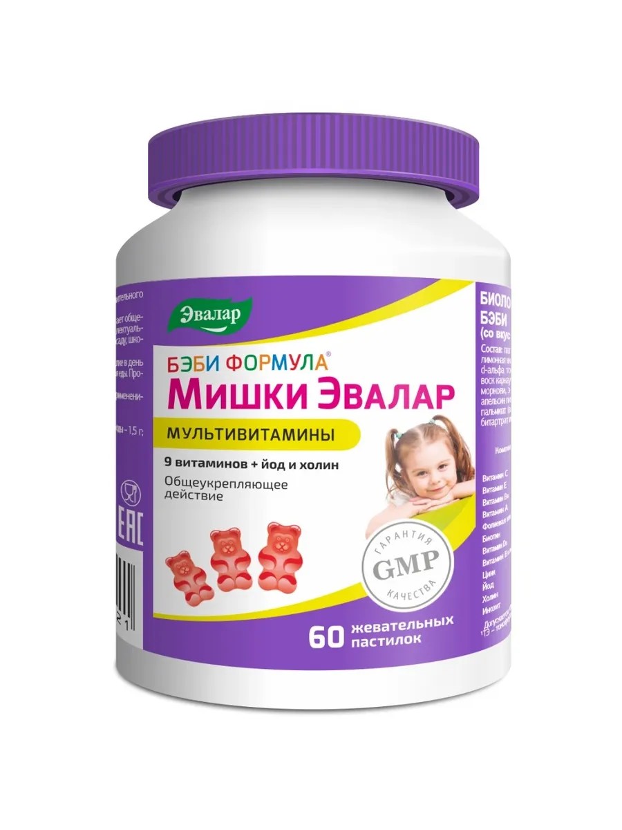 Беби-формула мишки мультивитамины - витаминно-минеральный комплекс в виде жевательных мармеладных пастилок обладает общеукрепляющим действием и способствует: улучшению памяти и внимания, интеллектуальному развитию ребенка, поддержке организма ребенка в период адаптации в детском саду, школе, обогащению организма витаминами и минералами.