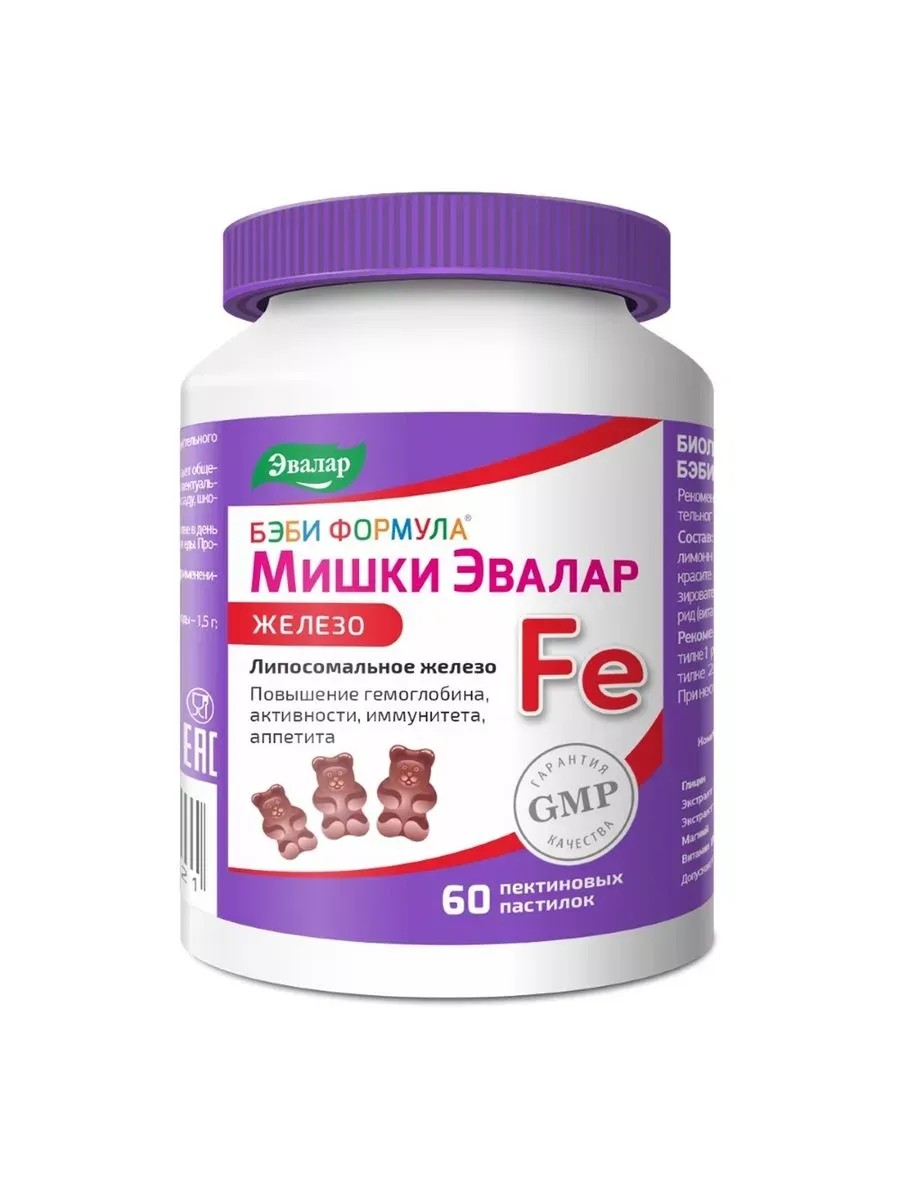 The amount of proteins, fats, carbohydrates and energy value per daily intake is less than 2% of the values ​​​​reflecting the daily requirement for proteins, fats, carbohydrates and energy. Normal hemoglobin levels are one of the key indicators of a child's health. The Baby Formula Bears Evalar Iron complex in the form of delicious gummy pastilles based on readily available liposomal iron was created specifically to normalize hemoglobin levels and replenish iron deficiency in the child's body. Helps: • prevent iron deficiency anemia • increase hemoglobin and ferritin levels • reduce fatigue • increase mental and physical activity • strengthen the immune system • improve appetite