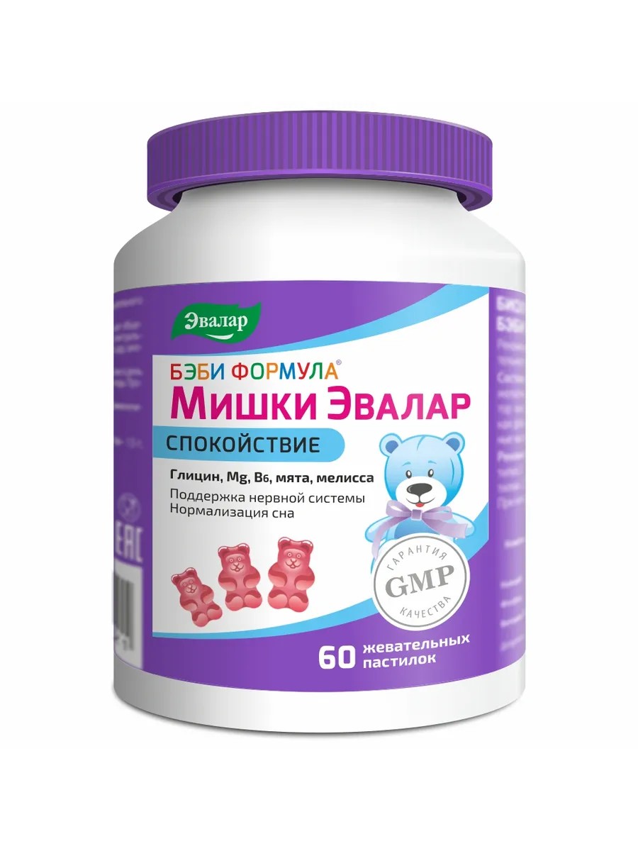 Жевательные пастилки Мишки для спокойствия ребятишек! Детям с 3 лет. Грамотно подобранные компоненты комплекса: глицин, магний и витамин B6, усиленные натуральными экстрактами мелиссы и мяты – оказывают нормализующее действие на процессы возбуждения и торможения в центральной нервной системе и способствуют: - Успокаивающему эффекту - Поддержанию нервной системы ребенка при повышенных нагрузках - Уменьшению возбудимости и тревоги - Повышению концентрации внимания - Усидчивости - Нормализации сна Как работают ингредиенты-Глицин снижает беспокойство, снимает стресс, стимулирует умственную деятельность, устраняет агрессию, нормализует сон, предупреждает мозговые и вегето-сосудистые расстройства. На сегодняшний день Бэби Формула Мишки Спокойствие Эвалар – это единственные пастилки для детей, содержащие в своем составе глицин.--Магний. По словам специалистов, магний имеет основополагающее значение для здоровья детского организма. Учитывая, что этот микроэлемент является компонентом сотен ферментов, он влияет на каждый физиологический процесс, который протекает в организме. Одним из важных действий магния в организме является антистрессовое. При дефиците этого макроэлемента у детей появляются симптомы социальной дезадаптации и расстройства поведения (раздражительность, тревожность, плаксивость), а также нарушения сна (бессонница, ночные кошмары с проливным потом, трудности с засыпанием).--Экстракты мелиссыи мяты оказывают седативное, расслабляющее и успокаивающее действие на организм. Специалисты рекомендуют давать их гиперактивным детям, неспособным сосредоточиться – растения улучшают память, усидчивость и способности к концентрированию.-Преимущества:-Первые и единственные Мишки для спокойствия ребятишек!-Приятный клубничный вкус.-Без искусственных красителей, ароматизаторов и консервантов.-Без глютена и ГМО.-