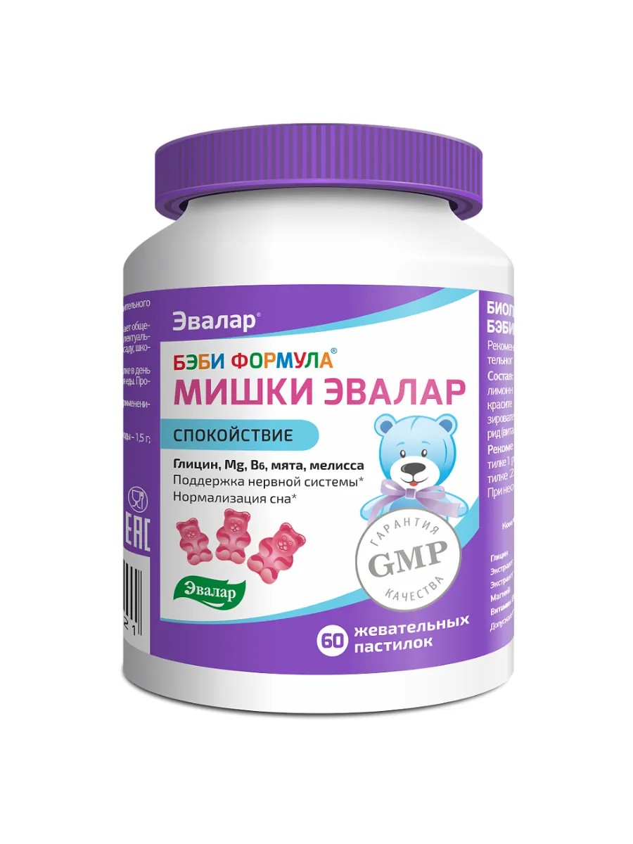 Бэби Формула Мишки Спокойствие от компании Эвалар - это биологически активная добавка (БАД) к пище – первые мармеладные мишки с глицином и магнием для спокойствия и сна ребятишек. Разработаны для детей от 3-х лет до старшего подросткового возраста. Грамотно подобранные компоненты комплекса – глицин, магний и витамин B6, усиленные натуральными экстрактами мелиссы и мяты – способствуют успокаивающему эффекту, поддержанию нервной системы ребенка при повышенных нагрузках, уменьшению возбудимости и тревоги, повышению концентрации внимания, усидчивости, нормализации сна. Эти вкусные мармеладные мишки со вкусом клубники являются незаменимым помощником для родителей, которые хотят уменьшить стрессовое воздействие на организм ребёнка, обеспечить своим детям спокойствие и уверенность в себе.