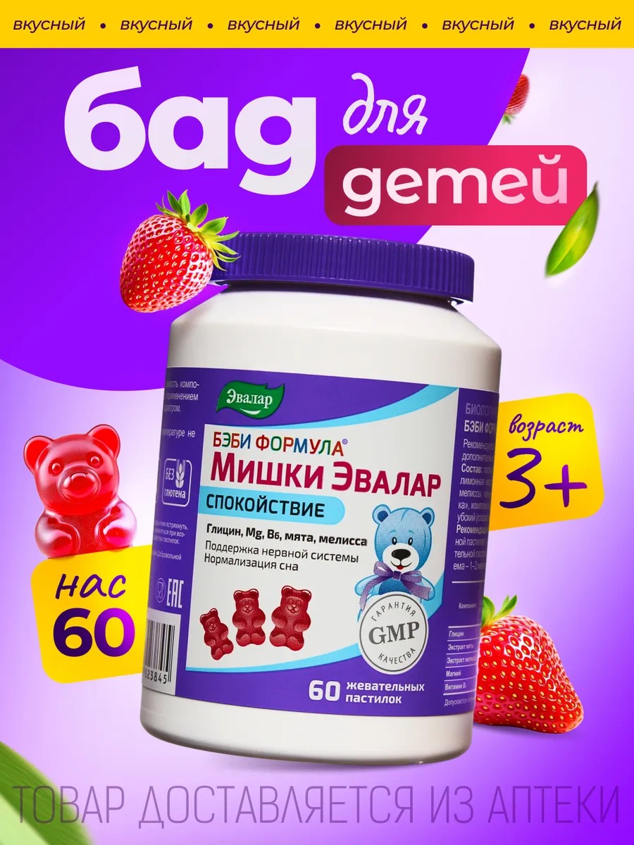 Baby Formula Bears Calm lozenges are designed for hyperactive children aged 3 years and older. Fidgeting, impulsiveness, absent-mindedness, and decreased learning ability are typical manifestations of hyperactivity in children, which parents should pay attention to. Carefully selected components of the complex: glycine, mint and lemon balm extracts, magnesium, and vitamin B6 have a normalizing effect on excitation and inhibition processes in the central nervous system and contribute to: A calming effect; Supporting the child's nervous system under increased stress; Reducing excitability and anxiety; Improving concentration; Perseverance; and Normalizing sleep. Ingredients: starch syrup, sugar, gelatin, magnesium lactate, glycine, citric acid (acidity regulator), mint extract, lemon balm extract, natural red coloring, natural strawberry flavoring, glazing agent (coconut and palm kernel oils, carnauba wax), pyridoxine hydrochloride (vitamin B6). Glycine reduces anxiety, relieves stress, stimulates mental activity, eliminates aggression, normalizes sleep, and prevents cerebral and vegetative-vascular disorders. Today, Evalar Baby Formula Calm Bears are the only lozenges for children containing glycine. Magnesium. According to experts, magnesium is fundamental to the health of a child's body. Considering that this microelement is a component of hundreds of enzymes, it affects every physiological process that occurs in the body. One of the important effects of magnesium in the body is anti-stress. A deficiency of this macronutrient in children can cause symptoms of social maladjustment and behavioral disorders (irritability, anxiety, tearfulness), as well as sleep disturbances (insomnia, nightmares with profuse sweating, difficulty falling asleep). Extracts of lemon balm and mint have a sedative, relaxing, and calming effect on the body. Experts recommend giving them to hyperactive children who are unable to concentrate – the plants improve memory, perseverance, and concentration. Children aged 3 to 7 years, chew one lozenge once daily with meals; children over 7 years, chew one lozenge twice daily with meals. Duration of treatment: 1-2 months. If necessary, treatment can be repeated.