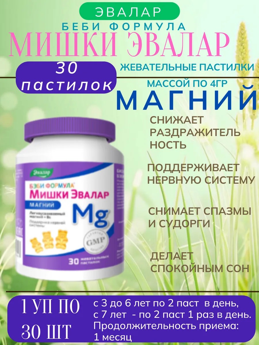 Бэби Формула Мишки Магний от компании Эвалар - это мармеладные пастилки для восполнения дефицита магния для детей с 3 лет, содержащие магний в легкоусвояемой органической форме.