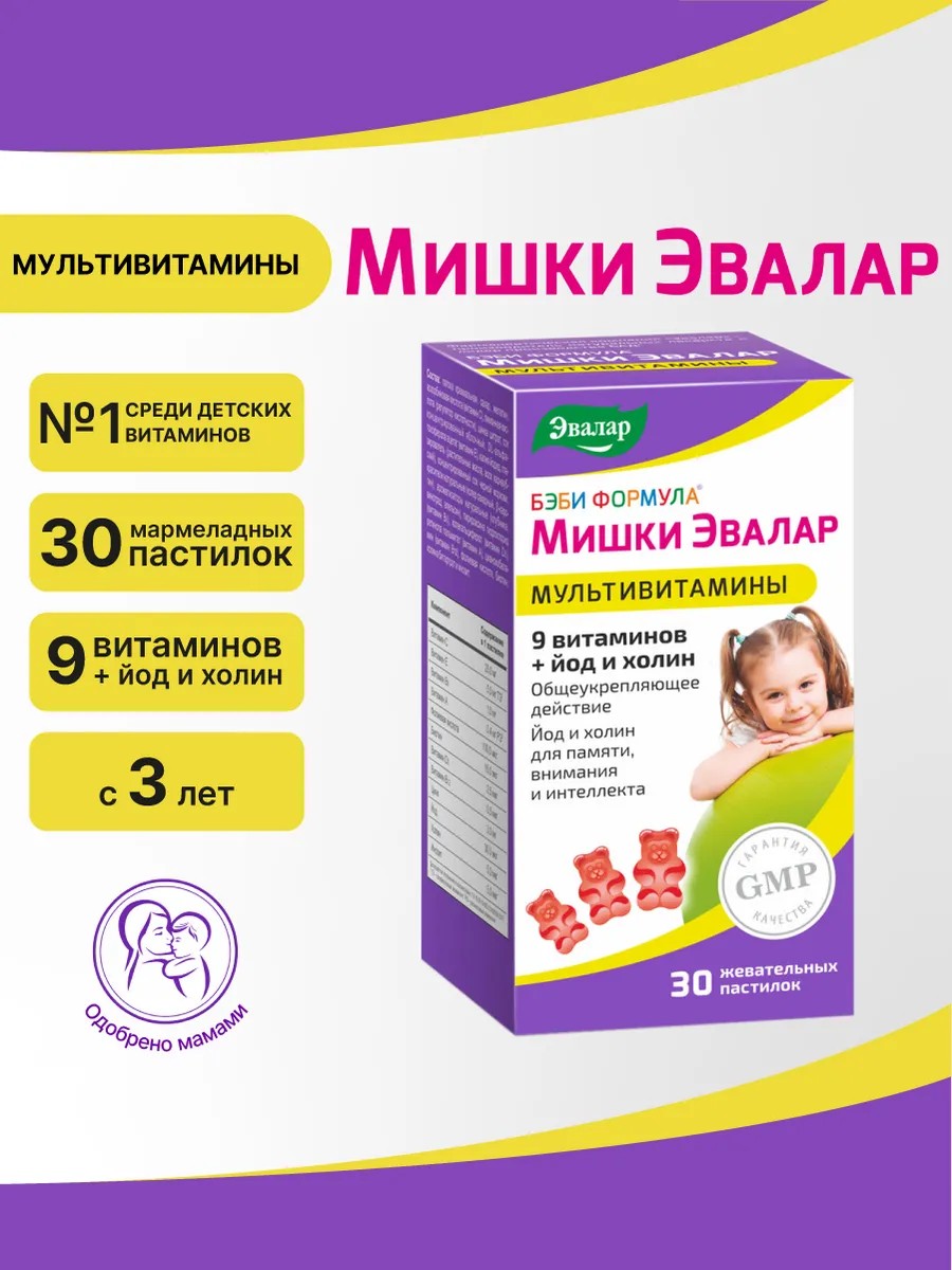 Мишки Эвалар Мультивитамины – идеальное решение для обогащения организма вашего ребенка витаминами и минералами. Мультивитамины обладают общеукрепляющим действием. А благодаря йоду и холину способствуют улучшению памяти, внимания и интеллектуального развития ребенка. Они также являются незаменимыми помощниками для детского организма в период адаптации в детском саду или школе, когда здоровье ребенка наиболее уязвимо. Мишки Эвалар Мультивитамины отличаются качественным составом, созданным на основе европейских ингредиентов высокого качества. В их состав входит натуральный сок, абсолютное отсутствие искусственных красителей, ароматизаторов и консервантов, глютена и ГМО .Мощный состав этих мультивитаминов радует богатым набором витаминов, дополненных необходимыми минералами для полноценного развития вашего ребенка. Приятный фруктовый вкус мармеладных витаминок нравится детям, делая прием комплекса легким и радостным. Бэби Формула Мишки Эвалар Мультивитамины также радует своей выгодной ценой по сравнению с импортными аналогами, при этом не теряя высокого качества. Эти мультивитамины соответствуют международному стандарту GMP, что подтверждает их высокую надежность и безопасность. Мишки Эвалар Мультивитамины получили заслуженный Знак Качества "Лучшее – детям", что делает их еще более привлекательным выбором для заботливых родителей.
