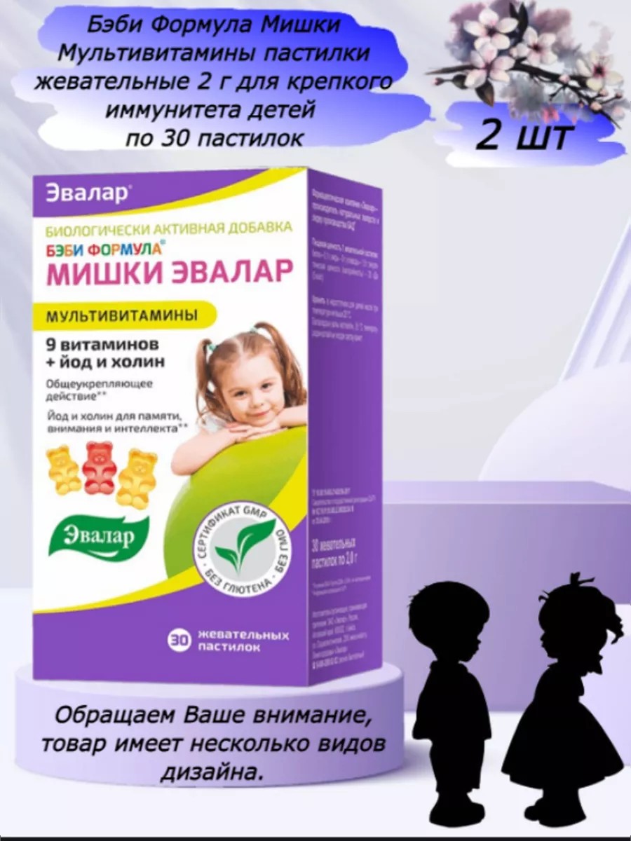 Мишки Эвалар Мультивитамины представляют собой уникальный комплекс, содержащий витамин С, витамин Е, витамин В6, витамин А, фолиевую кислоту, биотин, витамин D3, витамин В12, цинк, йод, холин и инозит. Этот продукт обладает общеукрепляющим действием и является важным фактором для поддержания здоровья и развития ребенка, а также способствует лучшению памяти и внимания, интеллектуальному развитию ребенка и поддержке организма ребенка в период адаптации в детском саду или школе. Наша формула мультивитаминов для детей обеспечивает ежедневное насыщение организма витаминами и минералами, необходимыми для обеспечения оптимального самочувствия и правильного развития. Витамины помогают обогатить организм детей важными питательными веществами. Мишки Эвалар Мультивитамины обеспечивают ребенку необходимые витамины и минералы для его роста, развития и общего благополучия, они оказывают общеукрепляющий эффект, улучшают память и внимание, а также способствует интеллектуальному развитию. Наш продукт разработан специально для детей с 3 лет и старше, и предлагает оптимальное сочетание витаминов и минералов, необходимых в этом возрасте. Наша продукция отличается высоким качеством и безопасностью, и представляет собой надежный выбор для поддержания здоровья вашего ребенка, так как произведена по международному стандарту качества GMP. Бэби Формула Мишки Мультивитамины получили Знак Качества «Лучшее – детям». Детские витамины Эвалар выпускаются без использования консерватнов, исскуственных крастителей и ароматизаторов, глютена и ГМО. В качестве основы использованы натуральные соки фруктов. Обеспечьте ребенку полноценное питание необходимыми и витаминами и минералами.