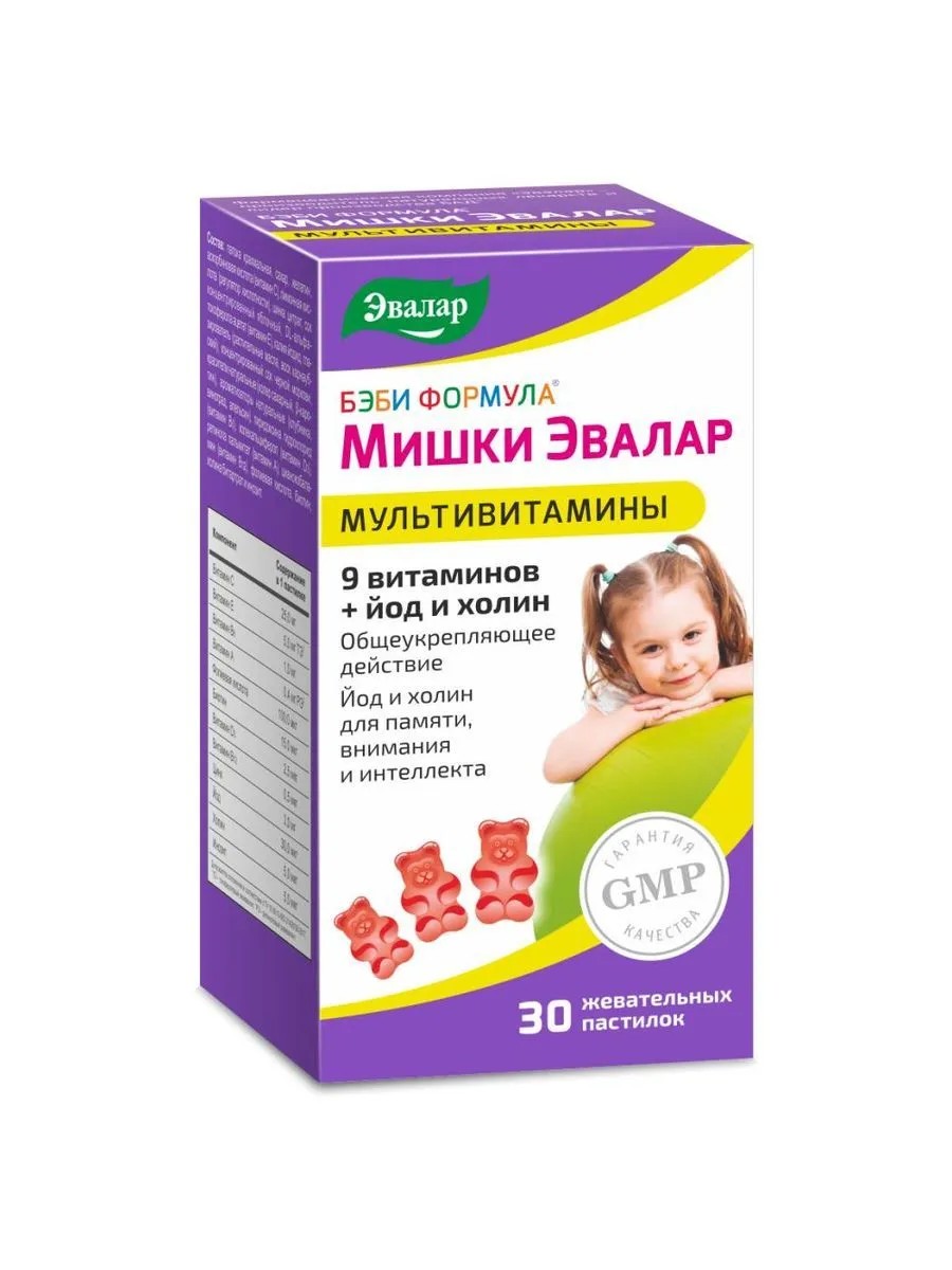 бэби формула мишки мультивитамины n30 жев пастилки по 2,0г. дополнительный источник цинка, йода, витаминов а, е, d3, c, в6 и фолиевой кислоты. в качестве бад к пище детям с 3 лет. патока крахмальная, сахар, желатин, аскорбиновая кислота (витамин с), лимонная кислота (регулятор кислотности), цинка цитрат, сок концентрированный яблочный, d-альфа токоферола ацетат (витамин е), калия йодид, глазирователь (растительные масла, воск карнаубский), красители натуральные (колер сахарный, концентрированный сок черной моркови, экстракт картамуса, β-каротин), ароматизаторы натуральные (клубника, виноград, апельсин), пиридоксина гидрохлорид (витамин в6), холекальциферол (витамин d3), ретинола пальмитат (витамин а), цианокобаламин (витамин в12), фолиевая кислота, биотин, холина битартрат и инозит.. для реализации населению через аптечную сеть и специализированные магазины, отделы торговой сети в качестве биологически активной добавки к пище (далее согласно приложению)
