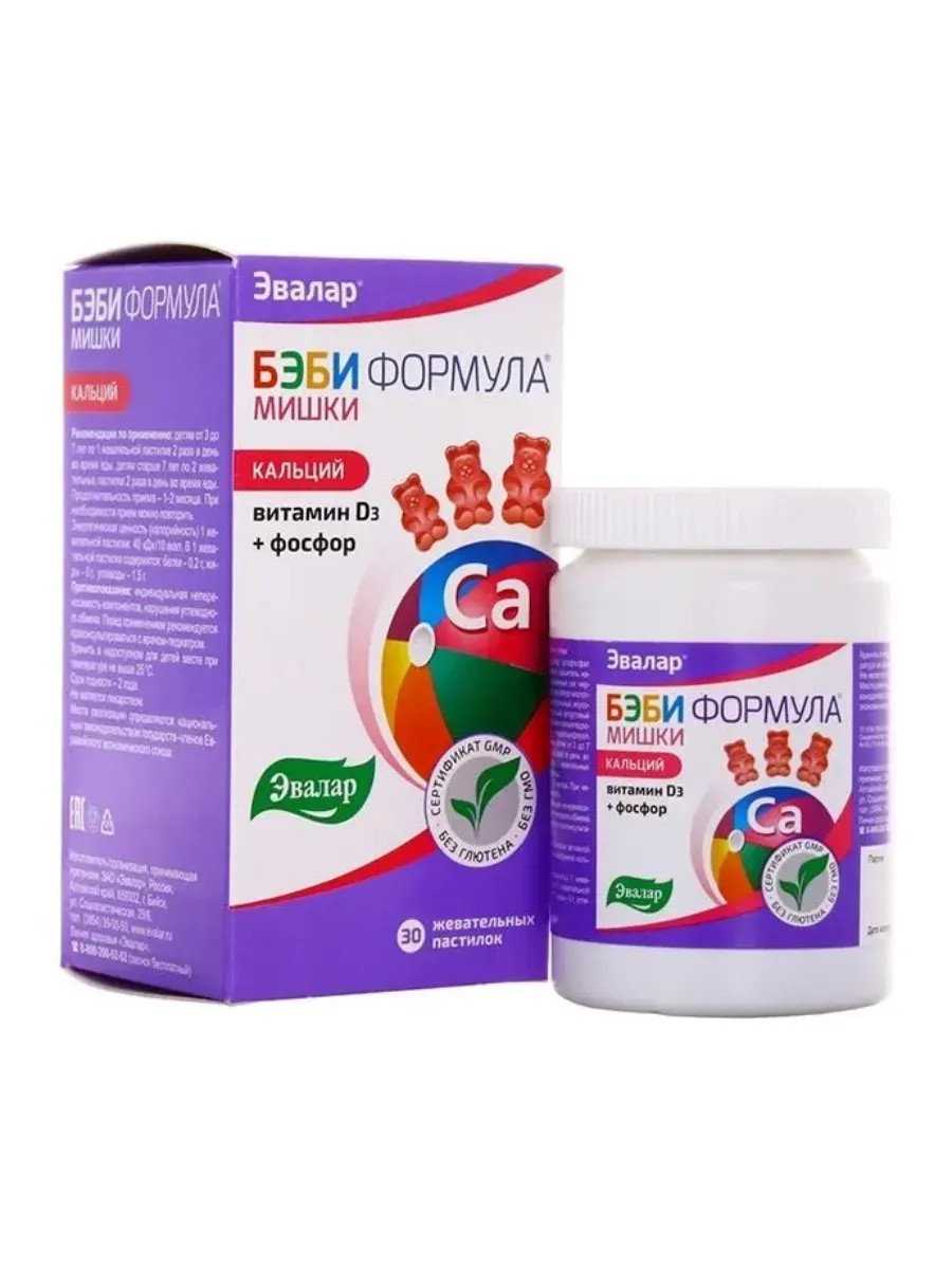 Вкусные жевательные пастилки с кальцием, витамином D3 и фосфором детям с 3 лет. Бэби Формула Мишки Кальций - это уникальный комплекс, разработанный специально для детей и содержащий сбалансированные профилактические дозировки кальция, витамина D и фосфора.