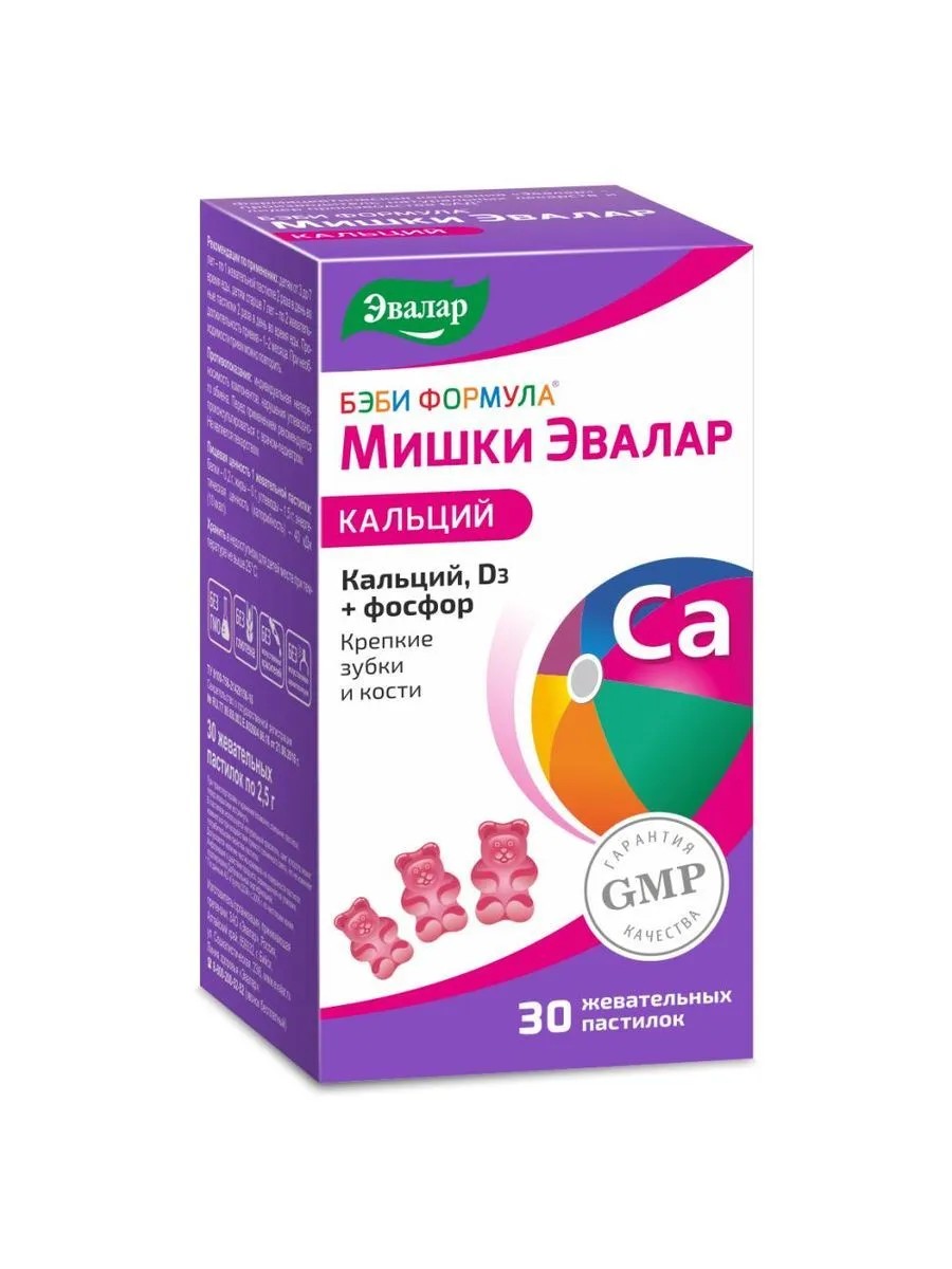 Baby Formula Bears Calcium N30 Chewable Pastilles, 2.5g. Additional Source of Calcium, Phosphorus, and Vitamin D3. As a Dietary Supplement. Starch Molasses, Sugar, Tribasic Calcium Phosphate, Gelatin, Natural Red Color, Citric Acid, Natural Strawberry Flavor, Natural Yogurt Powder, Glazing Agent, Cholecalciferol. For Sale to the Population as a Dietary Supplement - Additional Source of Calcium, Phosphorus, and Vitamin D3. (Hereinafter referred to as in the Appendix). Biologically Active Substances, mg/Pastille: Vitamin D3 - 2-2.5 mcg, Calcium - Not Less Than 100, Phosphorus - Not Less Than 50. -