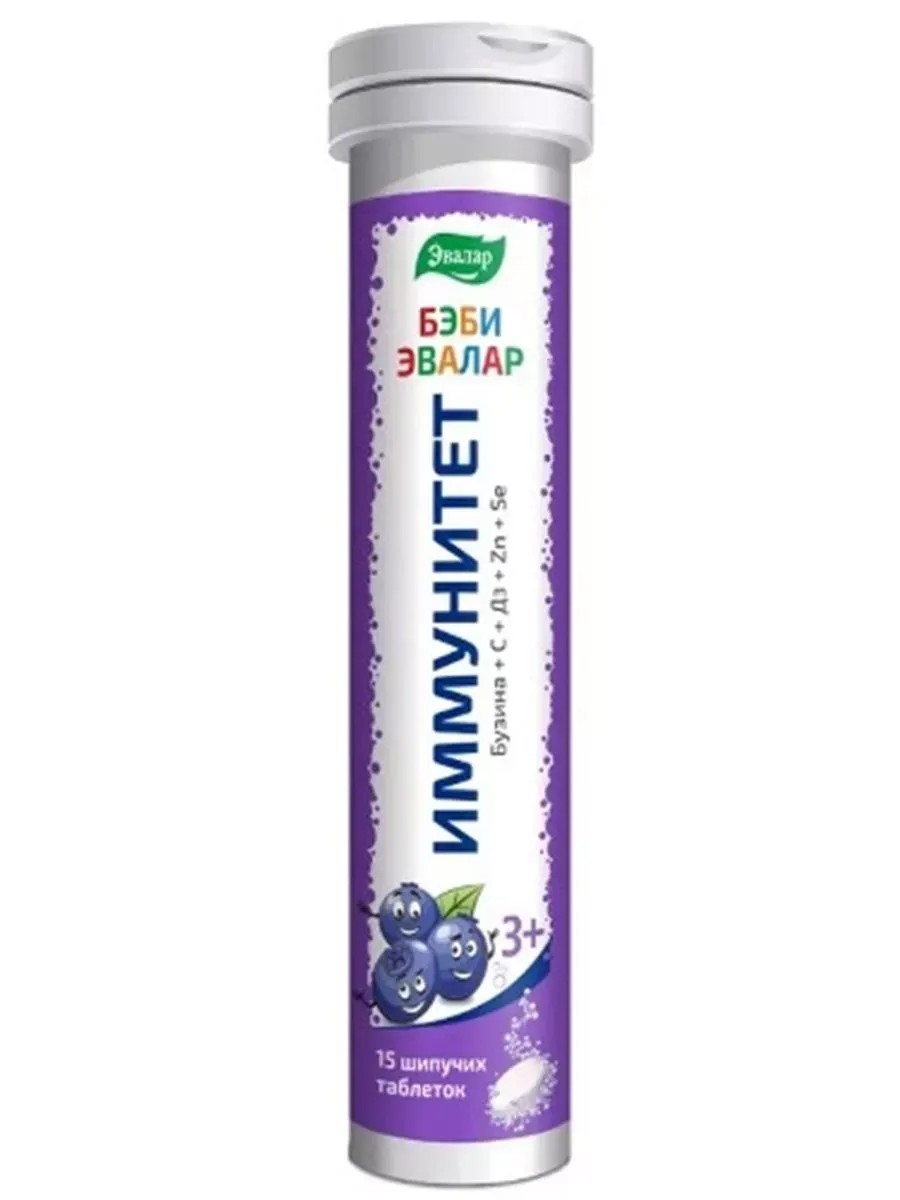 Бэби Эвалар иммунитет – это биологически активная добавка к пище (БАД) - детский шипучий напиток с соком бузины и витаминами для укрепления иммунитета. Для детей с 3 лет. Без подсластителей и искусственных добавок.Рекомендуется в качестве биологически активной добавки к пище - дополнительного источника витаминов С, D3, цинка, селена. Комплекс витаминов С, D3, цинка, селена и бузины способствует: поддержанию активности иммунной системы, эффективной профилактике простудных заболеваний, в том числе в сезон простуд, в период адаптации к детскому саду, школе; снижению риска развития простудных заболеваний, повышению устойчивости организма к вирусным инфекциям, облегчению самочувствия при простуде и ускорению выздоровления. Таблетки шипучие массой 5,0 г каждая, 15 штук в упаковке. Растворить 1 таблетку в 100 мл (1/2 стакана) воды комнатной температуры. Детям с 3-х лет принимать по 1 таблетке 1 раз в день. Продолжительность приема - не менее 1 месяца. Перед применением рекомендуется проконсультироваться с врачом.