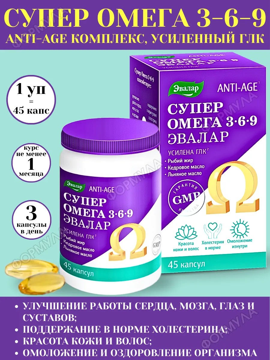 БАД Супер Омега 3-6-9 от компании Эвалар – сбалансированный комплекс трех жирных кислот – омега-3, омега-6 и омега-9, – усиленный ГЛК, который способствует: