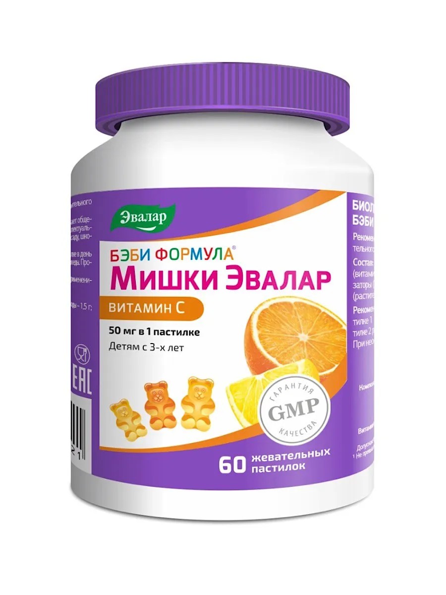 We present the ideal solution for supporting your child's health and normal development – Baby Formula Bears Vitamin C gummy bears from Evalar. These delicious bears will become your child's indispensable companion on the path to strong immunity and healthy growth. Vitamin C plays a vital role in the normal functioning of a growing child's body. It is involved in numerous processes, from the growth and development of bones and tissues to the synthesis of hemoglobin and the maintenance of healthy vision. However, one of the key functions of vitamin C is its protective role. It strengthens the immune system and helps the body better cope with infections and viruses. During the cold and flu season, when the body is especially vulnerable, Evalar Vitamin C gummy bears will provide reliable support. Evalar Vitamin C gummy bears are specially formulated for children aged 3 years and older and contain 100% of a child's daily requirement of vitamin C in one lozenge. They have a pleasant citrus flavor and are free of artificial colors, flavors, and preservatives, as well as gluten and GMOs. Evalar bears are made with natural juices and are approved by mothers! Directions: Children 3 to 7 years old: 1 chewable lozenge once daily with meals. Children over 7 years old: 1 chewable lozenge twice daily with meals. Duration of administration: 1-2 months. Repeat if necessary.