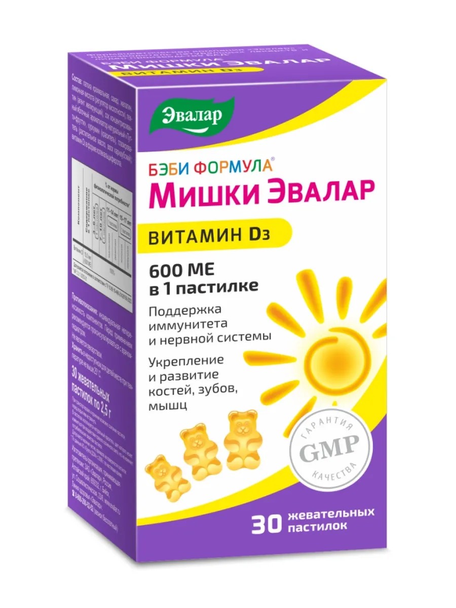 Бэби Формула Мишки Витамин Д3 от компании Эвалар - это биологически активная добавка (БАД) к пище - мармеладные мишки на натуральном соке для детей с 3 лет, содержащие 100% суточной нормы витамина D3 в 1 пастилке – 600 МЕ.