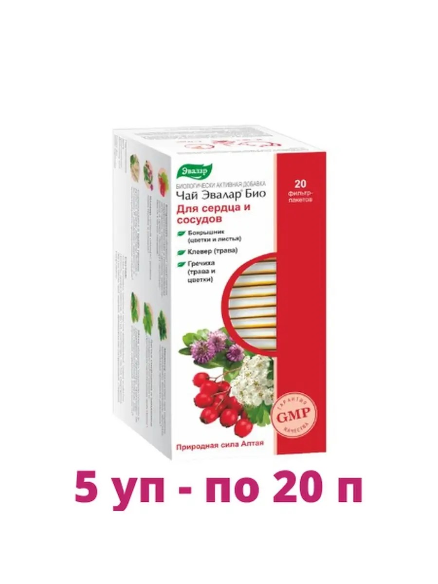 Чай Эвалар Био для сердца и сосудов ф/п N 20. Трава клевера содержит изофлавоноиды, оказывающие укрепляющее действие на стенки кровеносных сосудов, способствуя повышению их эластичности. Нормализует кровяное давление у женщин в период менопаузы, способствует улучшению кровообращения и разжижению крови. Цветки боярышника обладают спазмолитическими свойствами, избирательно, расширяя коронарные сосуды и сосуды головного мозга, влияют на уровень венозного давления и улучшению функций сосудистых стенок. Оказывают антиатеросклеротическое действие. Обладают седативной активностью. Трава гречихи применяется для профилактики гипо- и авитаминоза, а также при заболеваниях, сопровождающихся повышенной проницаемостью сосудистой стенки. Трава мелиссы благоприятно воздействует при сердечной недостаточности. При этом исчезает одышка, уходят боли в области сердца, нормализуется ритм сердечных сокращений и кровяное давление. Можно заказать комплекты по 2, 3, 4, 5 упаковок.