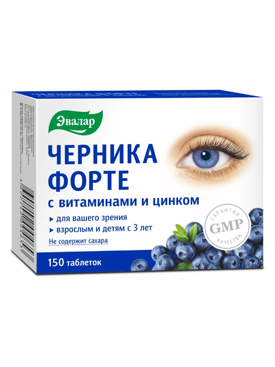 Эвалар Черника-Форте витамины для глаз + цинк, 150 таблеток