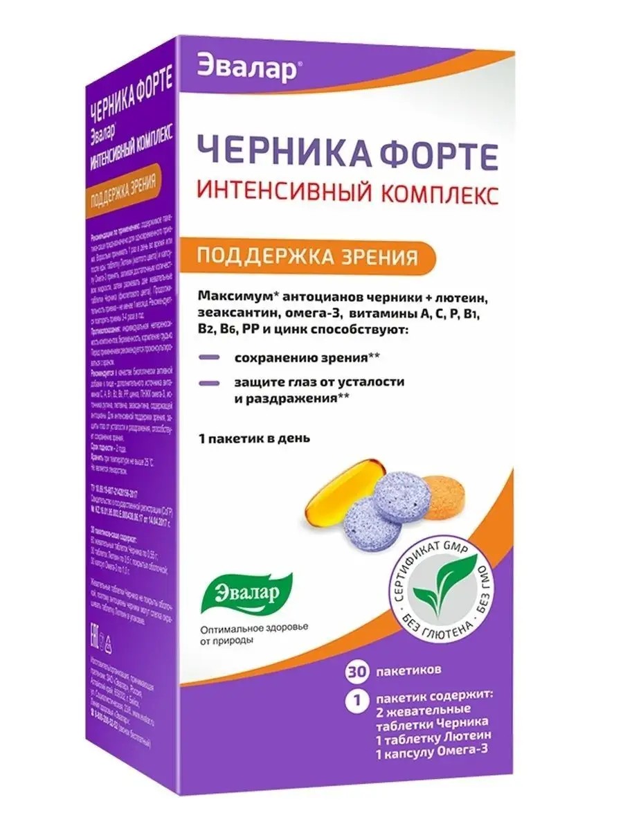 Интенсивный комплекс с черникой – Черника Форте Эвалар витамины для мужчин, витамины для женщин сбалансированно сочетает основные компоненты, необходимые для поддержания здоровья глаз. Ежедневный прием этого комплекса для зрения поможет вам улучшить зрительную функцию и эффективно защитить глаза.