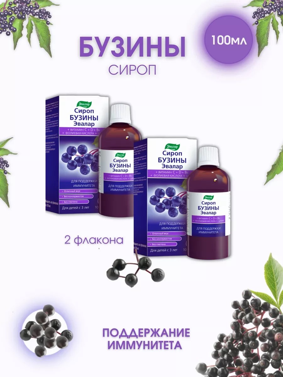 | Комплектация | Эвалар сироп бузины 100 мл; комплект из 2-х флаконов |