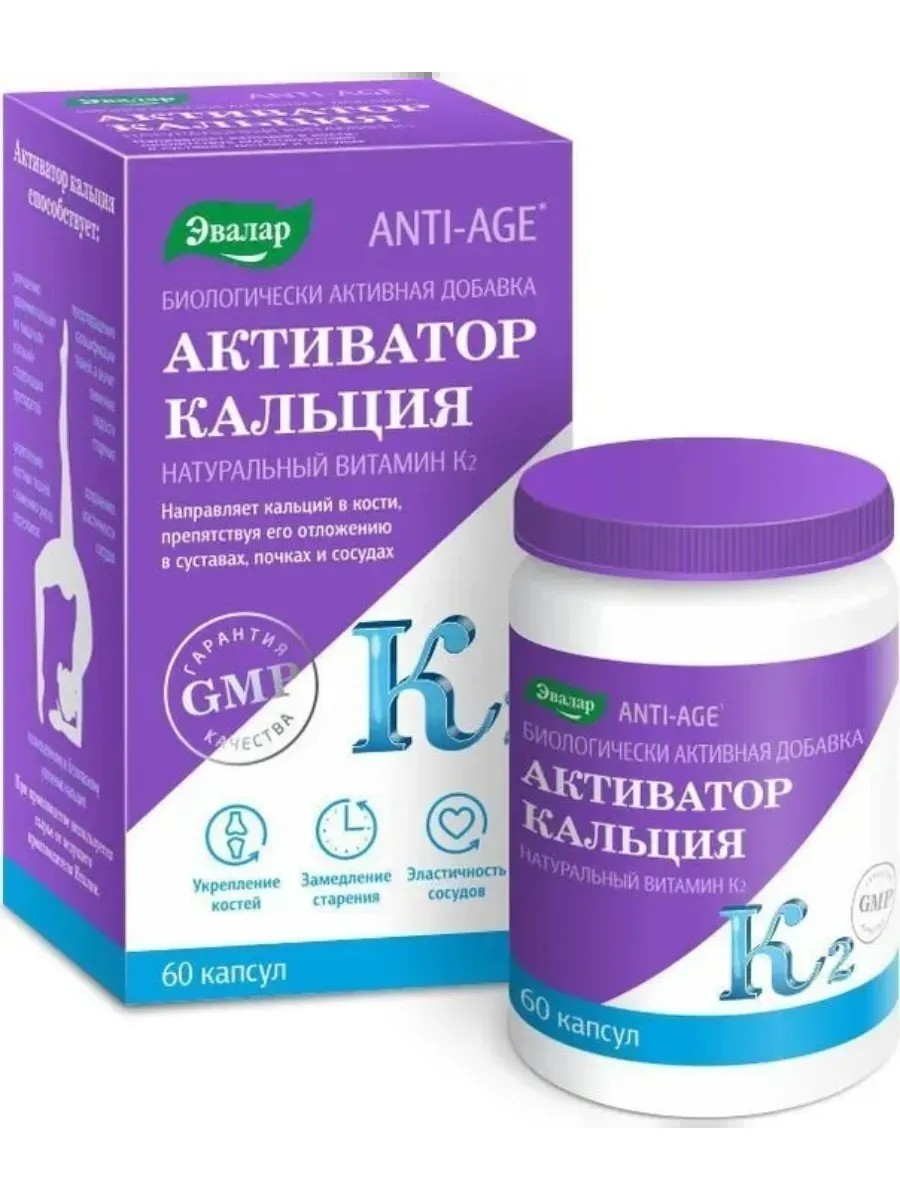Calcium Activator from Evalar: • Natural vitamin K2 in the form of MK-7 • Directs calcium to the bones, preventing its deposition on the vascular walls, in the kidneys and joints • Promotes the formation and maintenance of a dense bone structure, retains calcium in bone tissue, prevents the leaching of calcium from bones • High-quality raw materials from Gnosis (Italy) • The composition is enhanced with vitamin D3 and calcium • Manufactured in accordance with the international quality standard GMP.