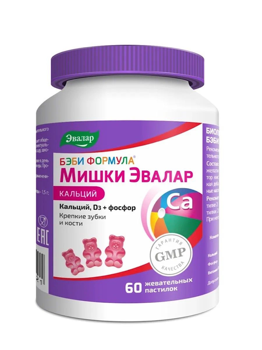 Детские витамины с кальцием "Бэби формула Мишки Кальций" содержат натуральные компоненты (фруктовый сок, только природные красители и ароматизаторы).Кальций. Является главным составляющим компонентом костей и зубов. Его роль для роста детей невозможно переоценить. Но кальций не способен усвоиться без помощи витамина D. Витамин D. Участвует в минеральном обмене, влияя на усвоение кальция, поэтому без такого витамина кости и зубки ребенка будут менее твердыми и более хрупкими, а их развитие нарушится. Нехватка витамина D сказывается на росте костей и провоцирует истончение эмали. Данное вещество также способствует лучшему усвоению и фосфора. Фосфор. Обеспечивает сопротивляемость наружного слоя эмали и является наиболее эффективным в детском возрасте, когда эмаль еще не зрелая. Без него зубы могут стать ослабленными, сильно подверженными разрушительному воздействию, тусклыми. Бэби Формула Мишки Кальций - это уникальный комплекс витаминов, разработанный специально для детей и содержащий сбалансированные профилактические дозировки кальция, витамин d и фосфора. Действуя вместе, компоненты комплекса Бэби Формула Мишки Кальций витамины для детей комплекс способствуют: Снижению риска развития кариеса, Укреплению зубов и костей, Формированию правильной осанки. Бад не содержит глютена и гмо. Способ применения: Детям от 3 до 7 лет – по 1 жевательной пастилке 2 раза в день во время еды, детям старше 7 лет – по 2 жевательные пастилки 2 раза в день во время еды. Продолжительность приема — 1-2 месяца. При необходимости прием можно повторить. Противопоказания: Индивидуальная непереносимость компонентов, нарушения углеводного обмена. Перед применением рекомендуется проконсультироваться с врачом-педиатром.