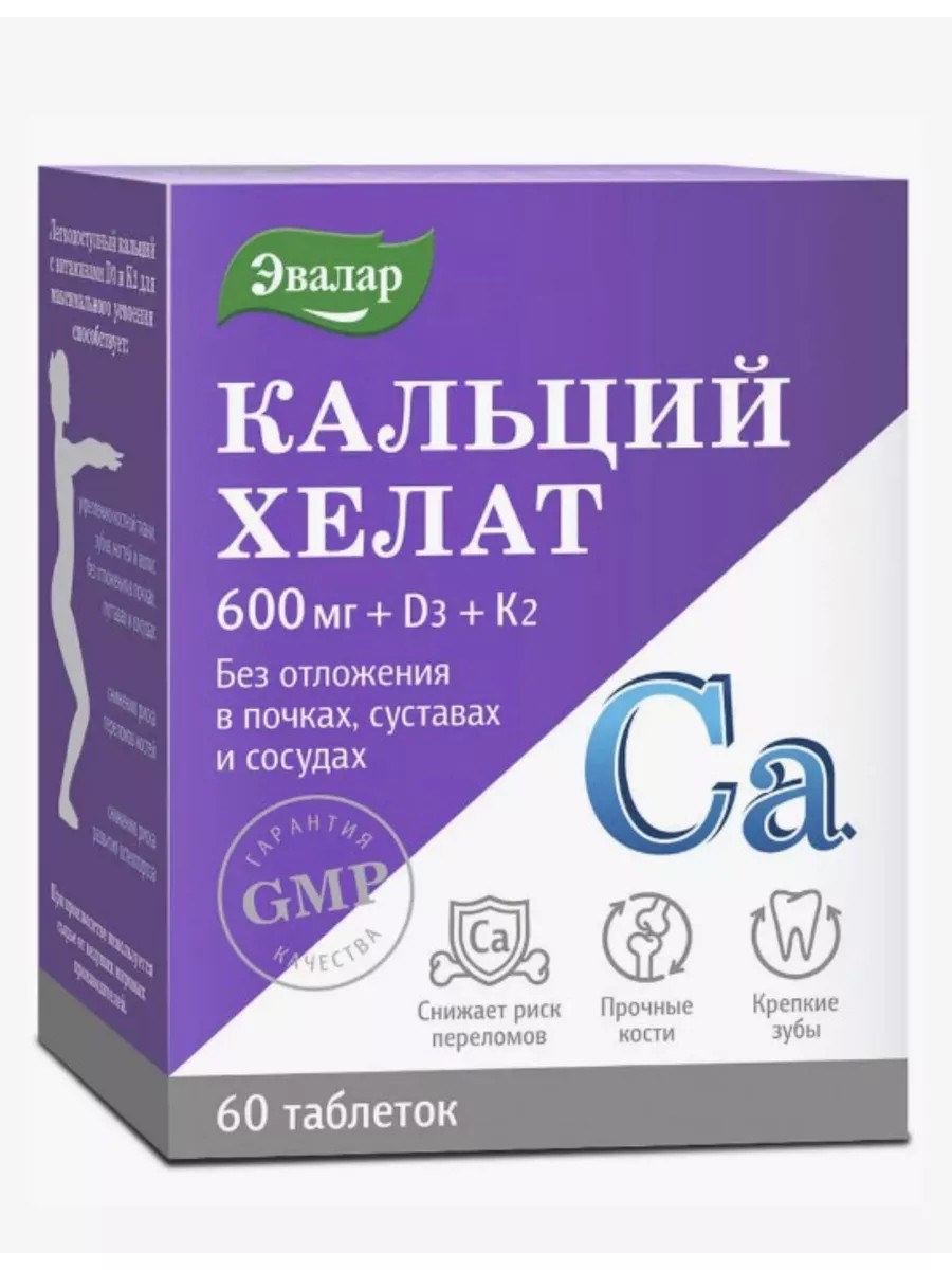 A dietary supplement (DS), a readily available chelated complex for maximum calcium absorption. Calcium chelate Evalar is an additional source of calcium, enhanced with vitamins D3 and K2. Calcium chelate Evalar maximally replenishes calcium deficiency in the body without depositing it in the kidneys, joints, and blood vessels, maintains normal bone tissue and teeth, improves the functionality of blood vessels and the heart, and directs calcium "straight to the target." Calcium chelate is well absorbed without gastrointestinal side effects (does not cause bloating, constipation, or diarrhea), as it does not affect stomach acidity.