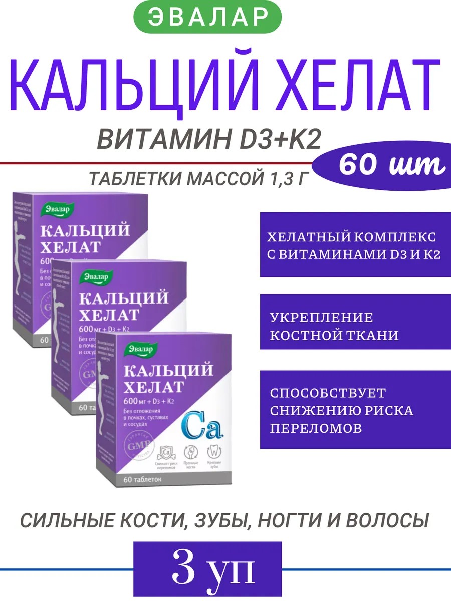Эвалар Кальций Хелат 60 табл по 1,3г витамин D3+k2-3уп
