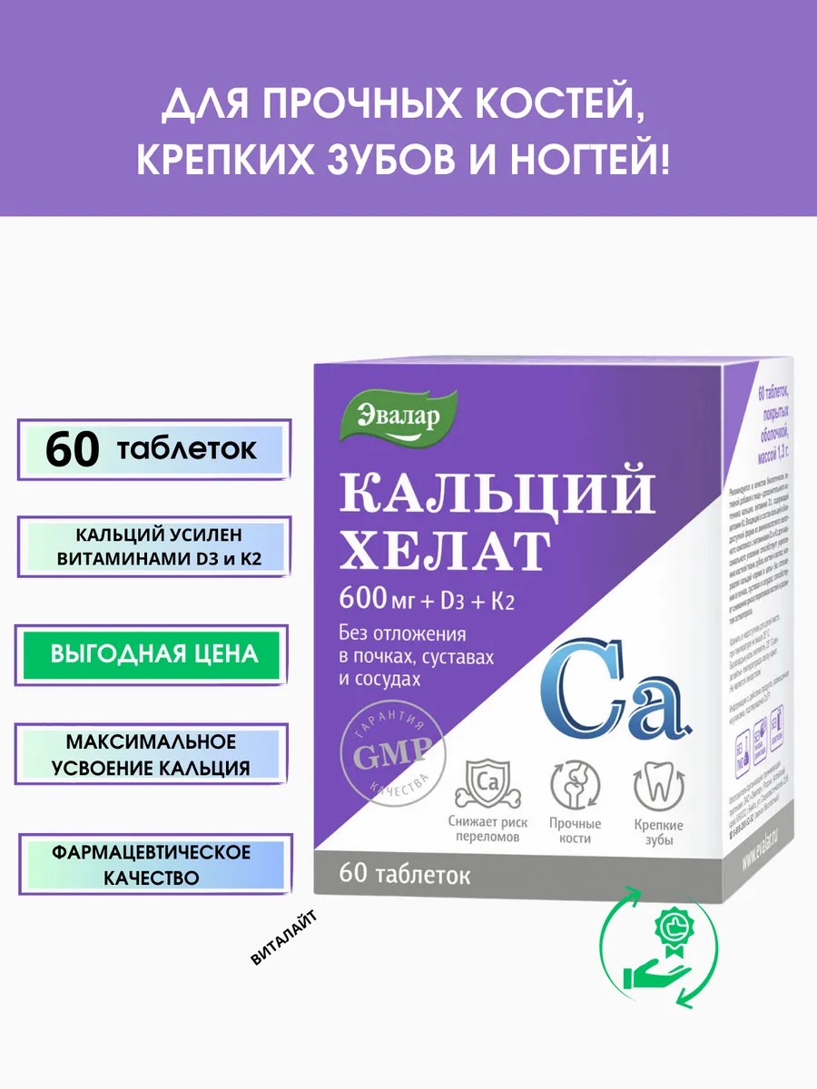 Кальций хелат Эвалар – это биологически активная добавка к пище (БАД), легкодоступный хелатный комплекс для максимального усвоения кальция. Кальций хелат Эвалар – дополнительный источник кальция, усиленный витаминами D3 и К2. Кальций хелат Эвалар максимально восполняет дефицит кальция в организме без отложения в почках, суставах и сосудах, поддерживает нормальное состояние костной ткани, зубов, способствует улучшению функционального состояния сосудов и сердца, направляет кальций «прямо в цель». Взрослым принимать по 3 таблетки в день во время еды. Беременным и кормящим женщинам при дефиците витамина D3 принимать по рекомендации врача. Продолжительность приема – не менее 1 месяца. При необходимости курс приема можно повторять. Перед применением рекомендуется проконсультироваться с врачом