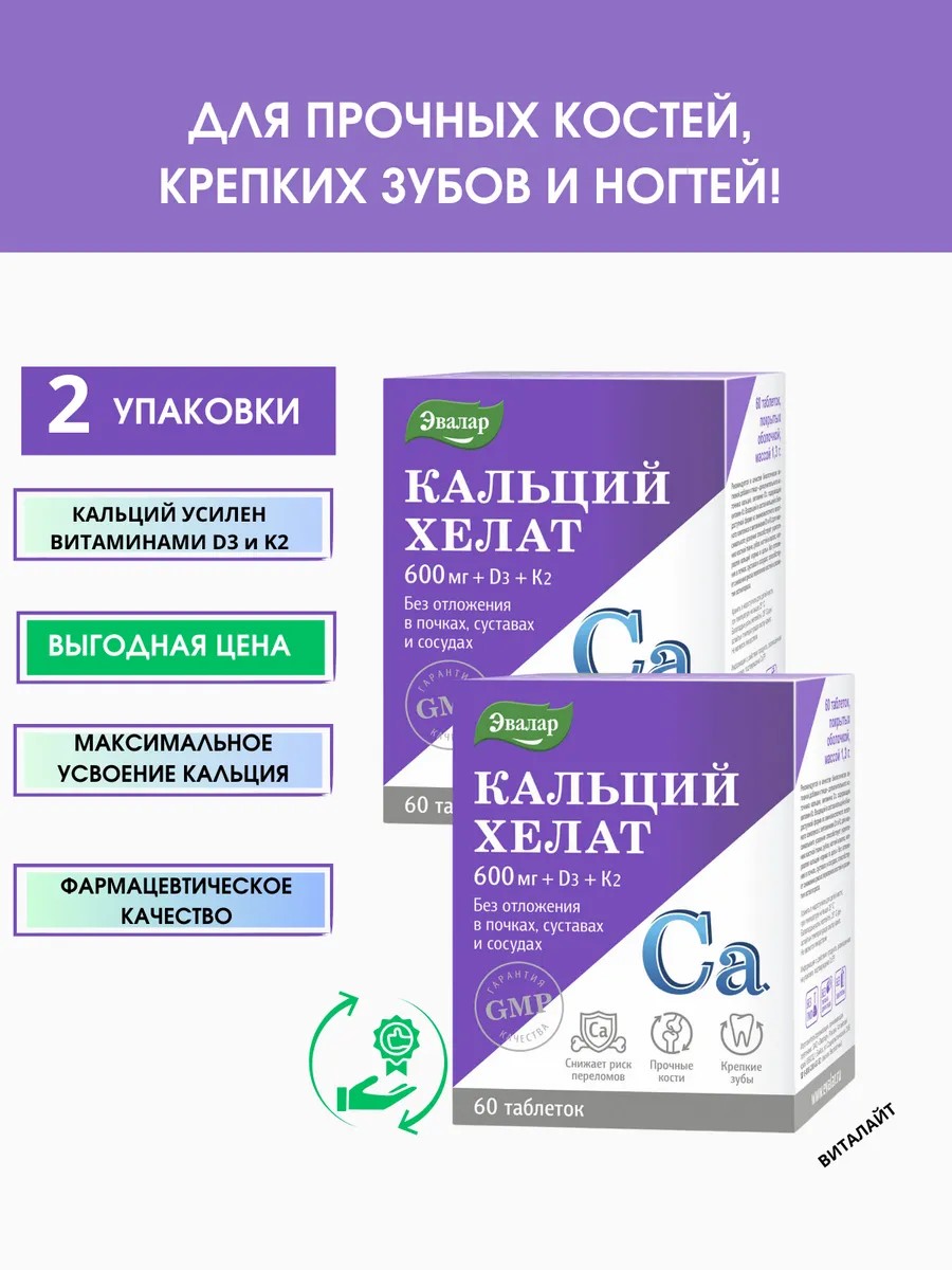 Кальций хелат Эвалар – это биологически активная добавка к пище (БАД), легкодоступный хелатный комплекс для максимального усвоения кальция. Кальций хелат Эвалар – дополнительный источник кальция, усиленный витаминами D3 и К2. Кальций хелат Эвалар максимально восполняет дефицит кальция в организме без отложения в почках, суставах и сосудах, поддерживает нормальное состояние костной ткани, зубов, способствует улучшению функционального состояния сосудов и сердца, направляет кальций «прямо в цель». Взрослым принимать по 3 таблетки в день во время еды. Беременным и кормящим женщинам при дефиците витамина D3 принимать по рекомендации врача. Продолжительность приема – не менее 1 месяца. При необходимости курс приема можно повторять. Перед применением рекомендуется проконсультироваться с врачом
