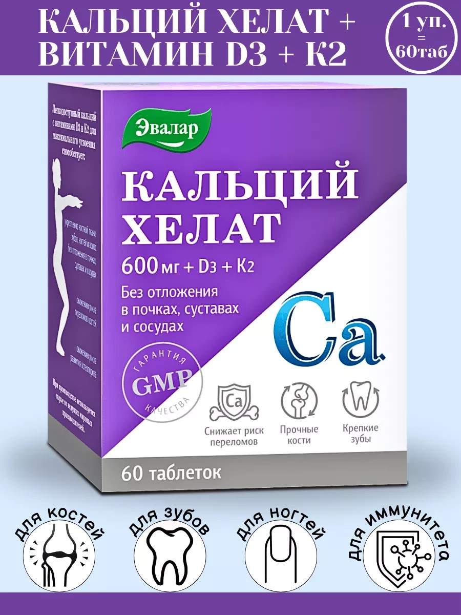Кальций хелат Эвалар – дополнительный источник кальция, усиленный витаминами D3 и К2.