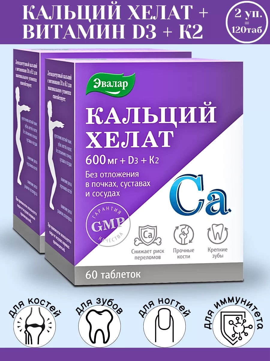 Эвалар Кальций хелат Д3 К2 для костей и иммунитета 60таб*2уп