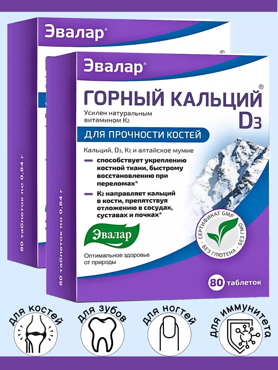 Эвалар Кальций горный + витамин Д3 + К2 для костей и иммунитета 2шт