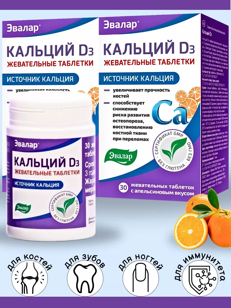 Кальций с витамином D3 - биологически активная добавка к пище, предназначенная для укрепления костей и зубов. Содержит в своем составе кальций - один из основных элементов, необходимых для роста и поддержания здоровья костей, зубов, волос и мышц. Витамин D3 способствует лучшему усвоению кальция и регулирует уровень кальция в крови, повышает иммунитет