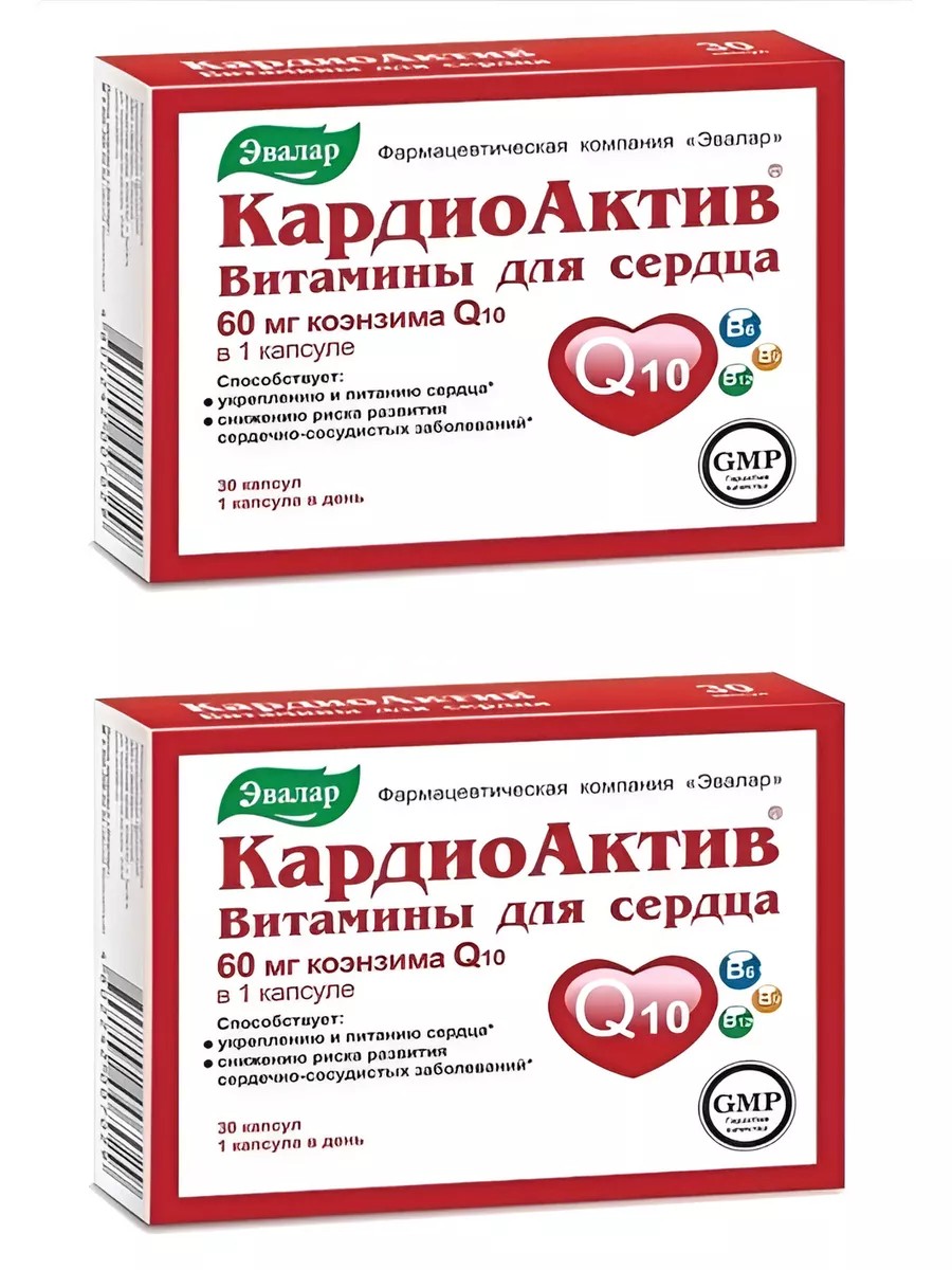 КардиоАктив витамины для сердца способствует выработке дополнительной энергии для поддержания нормальной работы сердца, замедлению процессов старения и снижению риска развития сердечно-сосудистых заболеваний.Активное вещество:коэнзим Q10, пиридоксина гидрохлорид, фолиевая кислота, цианокобаламин.В составе специальных витаминов для сердца КардиоАктив есть то, что необходимо для поддержания здоровья сердца: коэнзим Q10, фолиевая кислота, витамины В6 и В12.Витамины КардиоАктив:способствуют выработке дополнительной энергии для поддержания нормальной работы сердца, замедлению процессов старения и снижению риска развития сердечно-сосудистых заболеваний, помогают укрепить сердце и сосуды.Коэнзим Q10 - способствует восстановлению биоэнергетического метаболизма сердечной мышцы.Фолиевая кислота - не синтезируется в организме и является важнейшим веществом, участвующим в обменных процессах.Витамины группы В - также являются важным участником обменных процессов, их недостаток может негативно отразиться на сердце и сосудах. Влияют на скорость метаболизма аминокислот, в том числе - фолиевой кислоты.Средство «КардиоАктив Витамины для сердца» содержит суточную дозу перечисленных веществ, поэтому его можно принимать для восполнения дефицита витаминов.Содержание в 1 капсуле (суточном приеме)Коэнзим Q10, не менее 60 мгПиридоксин (витамин B6), не менее 2 мгВитамин В9, не менее 200 мкгВитамин B12, не менее 1 мкг