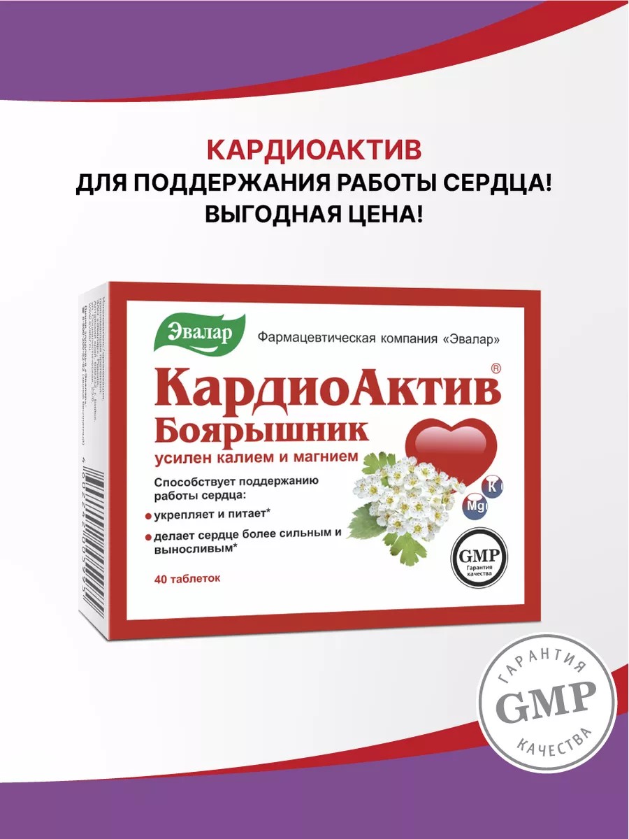 Hawthorn (flowers, leaves), thanks to the combined action of biologically active substances such as hydroxycinnamic acids, flavonoids, glycosides, tannins, saponins, and others, helps strengthen and nourish the heart. Potassium and magnesium are trace elements necessary for the normal functioning of all cells in the human body. They are also important for the functioning of the cardiovascular system. CardioActive is an affordable, enhanced heart nutrition that helps it cope with the hectic pace of modern life!