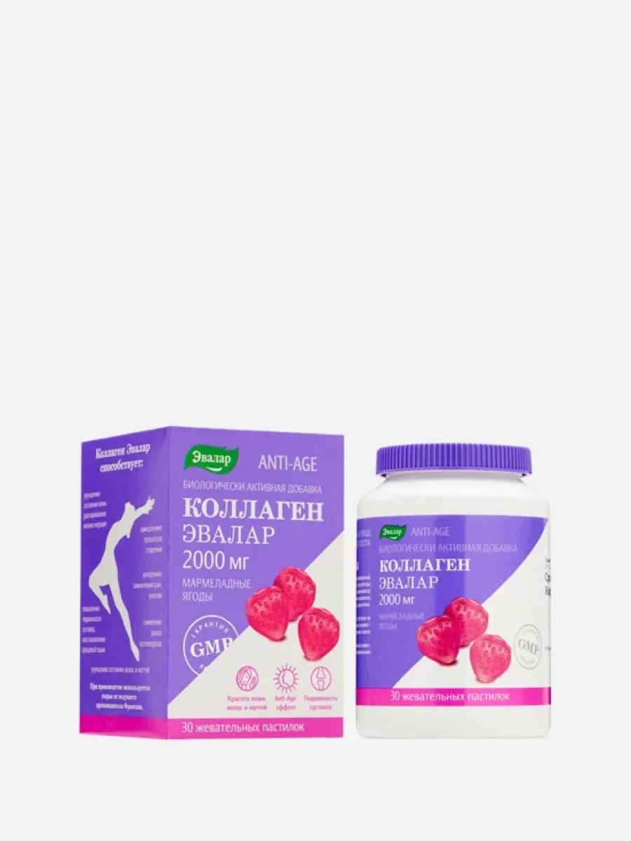 ЭВАЛАР anti-age Коллаген мармеладные ягоды; простой способ продлить молодость, сохранить красоту и легкость движений. Биологически активная добавка с гидролизованным коллагеном и витамином С легко усваивается организмом и решает сразу несколько задач. Она препятствует преждевременному старению, заботится о состоянии кожи, волос и ногтей, улучшает гибкость и подвижность суставов.