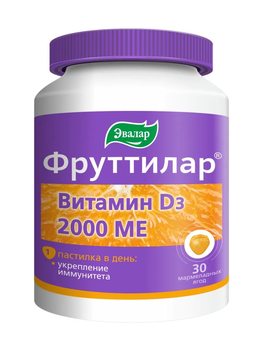 Витамин D3 2000 МЕ – это биологически активная добавка к пище (БАД). Содержит 2000 МЕ витамина D3 в 1 пастилке по 4 грамма каждая. Для тех, кто хочет не только получать от витамина D3 пользу, но и порадовать себя приятным вкусом. Фруттилар Витамин D3 способствует укреплению иммунитета и снижению риска развития простудных заболеваний, лучшему усвоению кальция, укреплению костей, зубов, снижению риска развития остеопороза, повышению силы мышц, поддержанию сердечно-сосудистой и нервной систем, регуляции репродуктивной функции организма, повышению уровня серотонина – «гормона счастья» и улучшению настроения. В изготовлении мармеладной основы используются натуральные пищевые компоненты: сахар, желатин (источник коллагена) и патока. Не требуют запивания. Взрослым — по 1 жевательной пастилке в день. Продолжительность приема — 2–3 месяца. Перед применением рекомендуется проконсультироваться с врачом.