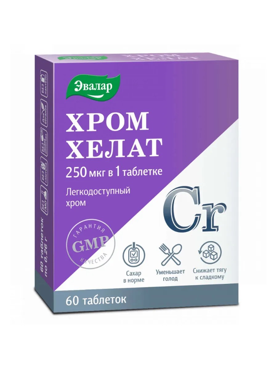 Chelates do not require additional biochemical transformations, as they are already prepared for absorption by the body. Advantages of Chromium chelate Evalar: - has a high degree of absorption; - convenient administration - 1 tablet per day; - high dosage of chromium - 250 mcg in 1 tablet; - in the composition, chromium is combined with the amino acid glycine, which in turn has a calming effect when dieting and losing weight; - convenient release form - the tablet can be chewed or dissolved, which additionally ensures faster absorption; - can be taken by vegetarians; - high-quality raw materials from Sweden are used in production; - manufactured in accordance with the international quality standard GMP.