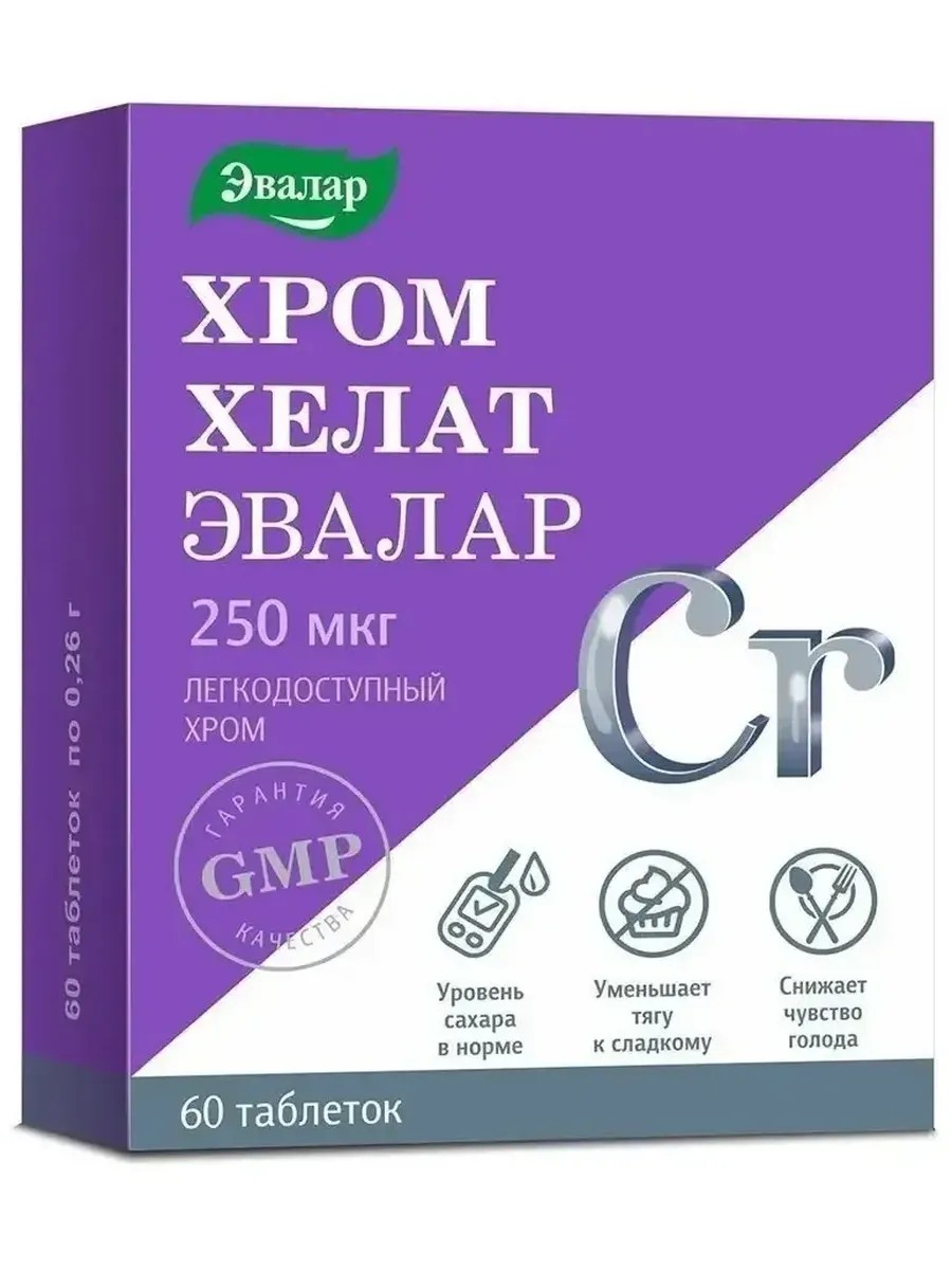 Хром хелат Эвалар способствует: поддержанию нормального уровня глюкозы в крови, предотвращая "скачки" сахара.