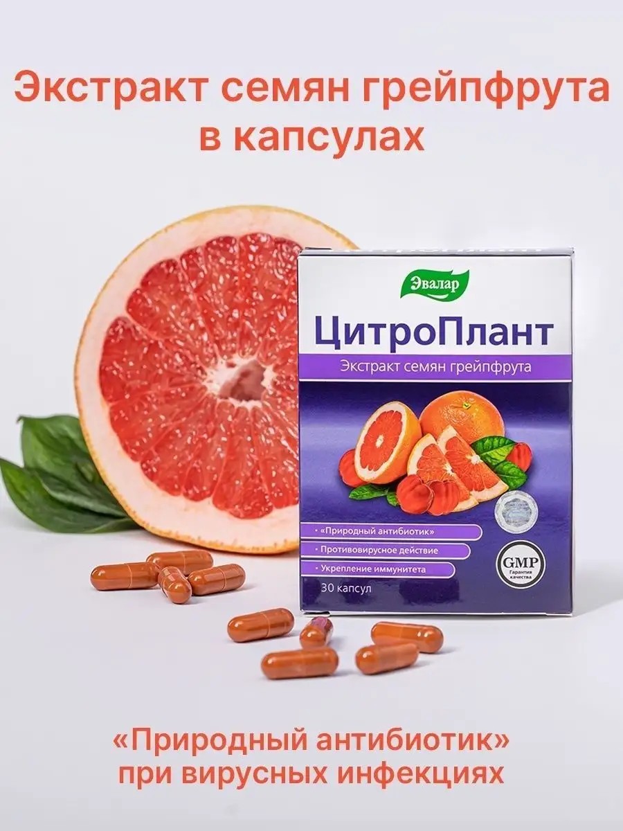 Цитроплант Эвалар — комплекс на основе экстракта семян грейпфрута для поддержки иммунитета взрослых и антиоксидантной защиты.