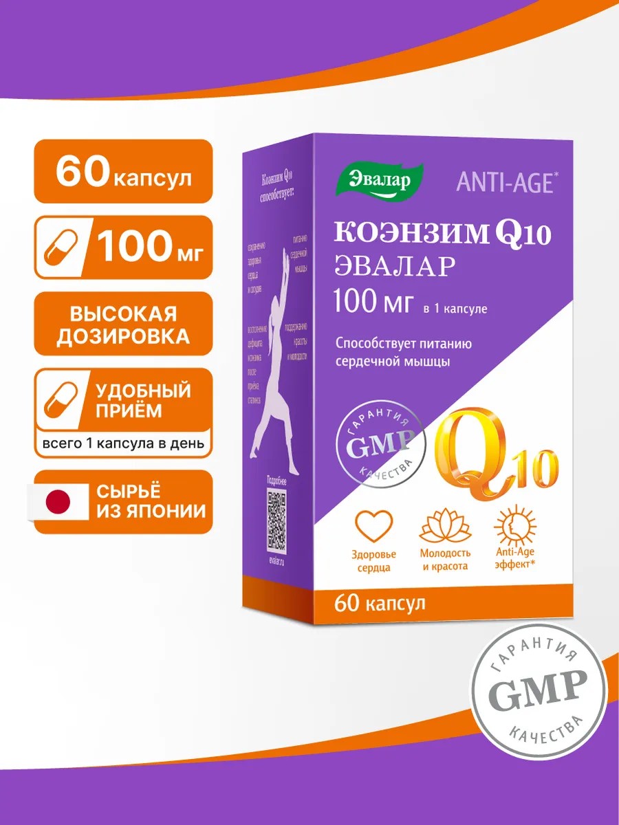 Эвалар Коэнзим Q10 100мг витамины для сердца и молодости, 60капсул