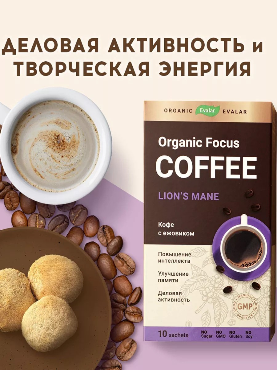 Instant coffee with hedgehog mushroom in bags for brewing in a cup. This dietary supplement, hedgehog mushroom, promotes cognitive health: - improves memory and learning ability; - increases productivity, attention, and concentration; - promotes intelligence, business activity, and creative energy. Natural coconut cream in the product imparts a soft and delicate taste, leaving a pleasant, subtle aftertaste. Organic, single-serve coffee in bags from Evalar is easy to use and a healthy alternative to regular coffee. Try this new superfood, and you'll truly enjoy it. Simply replace one cup of your regular coffee with a serving of hedgehog mushroom coffee to improve your memory and attention. Believe me, coffee can be not only delicious, but also healthy! 5 IMPORTANT BENEFITS OF COFFEE WITH HEDGEHOG BERRY: Each serving contains 300 mg of hedgehog mushroom, a natural brain booster. Natural coffee made from 100% Arabica beans grown in Brazil. Convenient sachets are ideal for use in the office or while traveling. Pleasant taste and easy consumption: simply pour 150 ml of hot water over the sachet contents and stir. Coconut cream softens the flavor and adds a sophisticated note. Free from sugar, soy, gluten, and GMOs. Chaga Collagen Coffee is suitable for vegans and keto dieters.