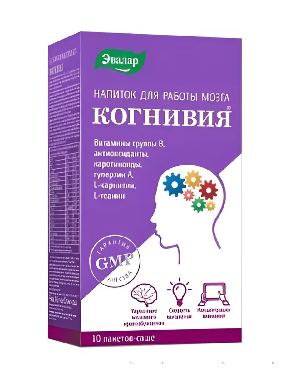 КОГНИВИЯ - Биологически активная добавка (БАД) к пище - напиток для работы мозга. Комплекс для оптимизации работы и здоровья когнитивной системыМногие сегодня задаются вопросом: что делать, если качество жизни требует высокой умственной активности, а мозг устал и не справляется.Действительно, надо быть сверхчеловеком, чтобы выдерживать бешеный темп, многозадачность, информационные перегрузки. Все это может приводить к стрессу - основной причине ухудшения работы мозга, снижения памяти и внимания.Содержание в 1 пакете-саше 14,5 г (суточном приеме) и % от рекомендуемого уровня суточного потребления (адекватного уровня):Магний 100 мг 25%Цинк 5 мг 33,3%Селен 50 мкг 71,4%Витамин С 300 мг 500%*Витамин B1 (тиамин) 5 мг 357,1%*Витамин B2 (рибофлавин) 6 мг 375%*Витамин B3 (ниацин) 35 мг 194,4%*Витамин B5 (пантотеновая кислота) 15 мг 250%*Витамин B6 6 мг 300%*Витамин B7 (биотин) 100 мкг 200%*Витамин B9 300 мкг 150%*Витамин B12 9 мкг 900%*Витамин D 15 мкг (600 МЕ) 300%*Витамин E 70 мг 700%*L-теанин 250 мг -L-карнитин 100 мг 33,3%Бета-каротин 2 мг 40%Лютеин 0,8 мг 16%Проантоцианидины 10 мг 10%Гуперзин А 100 мкг -Геспередин 5 мг 2,5%• активные вещества для улучшения работы головного мозга: гуперзин А, L-теанин, L-карнитин, лютеин, гесперидин;• витамины группы В, С, D, E;• антиоксиданты бета-каротин, проантоцианидины;• минералы: магний, цинк, селен.Напиток для работы мозга КОГНИВИЯ способствует:• улучшению показателей работы мозга: ясности мышления, усилению памяти, концентрации внимания, улучшению обучаемости, в том числе при усиленной умственной деятельности и возрастных изменениях (старении);• улучшению мозгового кровообращения и снабжения мозга питательными веществами и кислородом;• антиоксидантному действию - защите нейронов мозга от повреждения свободными радикалами.КОГНИВИЯ выпускается в удобной для приема форме порошка, из которого при растворении получается вкусный напиток.Для достижения максимального результата рекомендуется принимать совместно с капсулами Когнивия Фосфатидилсерин.Подходит взрослым любых возрастов.Благодаря сбалансированному набору нутриентов, необходимых для работы мозга, комплекс подходит:• активным людям, образ жизни которых - «включен 24/7»;• офисным работникам, стремящимся оставаться в интеллектуальном тонусе в течение всего дня;• студентам - при сдаче экзаменов, при обучении, при интенсивных умственных нагрузках;• спортсменам и киберспортсменам, рассчитывающим сохранить свои когнитивные (познавательные) функции в лучшем виде.Как работают ингредиентыКомплекс витаминов группы В, С, D, Е участвует в проведении нервных импульсов, улучшает микроциркуляцию в головном мозге, тем самым повышая доступ кислорода к мозгу. Поддерживает энергетический запас и деятельность головного мозга. Оказывает нейропротекторное, противовоспалительное и антиоксидантное действие на нейроны, способствует поддержанию здоровья нервной системы.Магний является естественным блокатором рецепторов, которые регулируют проникновение ионов кальция через мембрану нейронов, что защищает нейроны от повреждения. Повышает стрессоустойчивость, улучшает способность к обучению, рабочую память, кратко- и долгосрочную память.Цинк оказывает значительное влияние на формирование мозга, выступая в качестве нейромодулятора и нейромедиатора.Гуперзин А не дает разрушаться ацетилхолину, который осуществляет передачу н