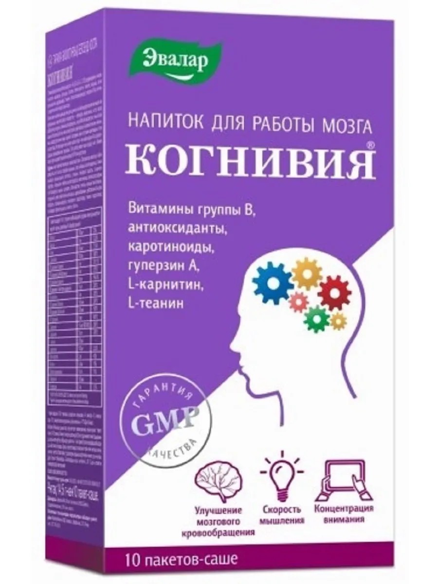 Когнивия порошок - это биологически активная добавка (БАД) к пище - напиток для работы мозга. Комплекс для оптимизации работы и здоровья когнитивной системы. Многие сегодня задаются вопросом: что делать, если качество жизни требует высокой умственной активности, а мозг устал и не справляется. Напиток для работы мозга КОГНИВИЯ от компании «Эвалар». Это специальный комплекс для оптимизации работы и здоровья когнитивной системы, который включает: