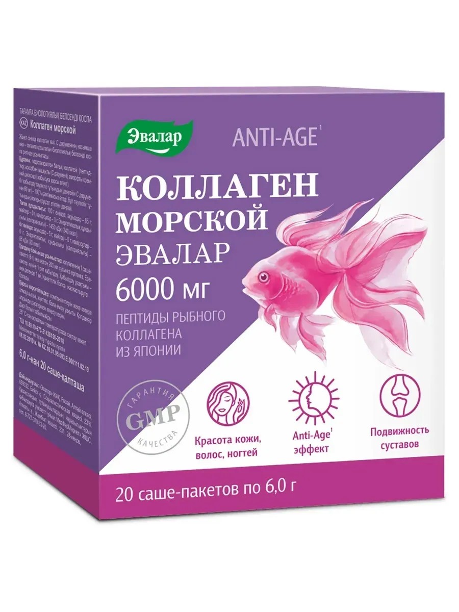 6000 мг пептидов рыбного коллагена из Японии в 1 саше! С возрастом наш внутренний источник красоты, силы и прочности постепенно угасает. Знаете ли вы, что после 25 лет мы ежегодно теряем 1-3% коллагена — того самого «белка молодости», снижение которого неизбежно приводит к видимым признакам старения? Добавьте к этому разрушающее воздействие главных врагов коллагена — токсинов и стресса, накапливаемых организмом. Можно маскировать проблемы с кожей и суставами, а можно активировать выработку коллагена изнутри, восстанавливая наш внутренний источник красоты и молодости на клеточном уровне. Какой путь выбираете вы? Коллаген морской Эвалар поддерживает формирование здорового коллагена изнутри для сильной и красивой кожи, здоровых ногтей и волос. Коллаген морской Эвалар способствует:-Улучшению состояния кожи, разглаживанию мелких морщин, повышению гладкости кожи, замедлению процессов старения (anti-age эффекту);--Повышению подвижности суставов, укреплению связок, уменьшению болевых ощущений, восстановлению хрящевой ткани;--Ускорению заживления ран и восстановлению соединительной ткани после травм, хирургического вмешательства, ожогов (улучшает регенерацию тканей);--Укреплению костной ткани, восстановлению костной ткани после переломов, снижению риска развития остеопороза.-Кроме того, Коллаген морской Эвалар улучшает состояние волос и ногтей; он не только восполняет запасы коллагена, но и стимулирует синтез собственного, «родного» коллагена и гиалуроновой кислоты, что обеспечивает упругость и эластичность кожи. Коллаген морской Эвалар — это:-Максимальная биодоступность. Гидролизованный рыбный коллаген в отличие от других форм коллагена усваивается организмом максимально эффективно. Уже через 6 часов после приема до 95% гидролизованного коллагена обнаруживается в крови и в тканях по всему телу.--Высокаядозировка коллагена в 1 саше – 6 000 мг.-Усиленный состав. Состав усилен витамином С, который стимулирует синтез собственного коллагена и гиалуроновой кислоты.-Удобство применения. Выпускается в форме порошка в саше-пакетах. Получите полезный белковый напиток, просто растворив 1 саше-пакетКоллагена морского в 200 мл любого напитка.-Качественное сырье из Японии. Сырьемдля Коллагена морского от Эвалар является кожа морских (или тихоокеанских) рыб, обитающих в естественной акватории. Кроме того, при выборе сырья Эвалар учитывает, что оно должно производиться из видов рыб с наиболее высоким содержанием белка.-Нейтральный вкус. Удобно смешивать с любыми холодными или горячими напитками, при этом Коллаген морской Эвалар не теряет своих свойств и не влияет на вкус и аромат напитка.-Не содержит ГМО,сахара,лактозы,сои и глютена.-br/Содержание в 6 г (суточном приеме) - коллаген рыбный гидролизованный не менее 5,8 г