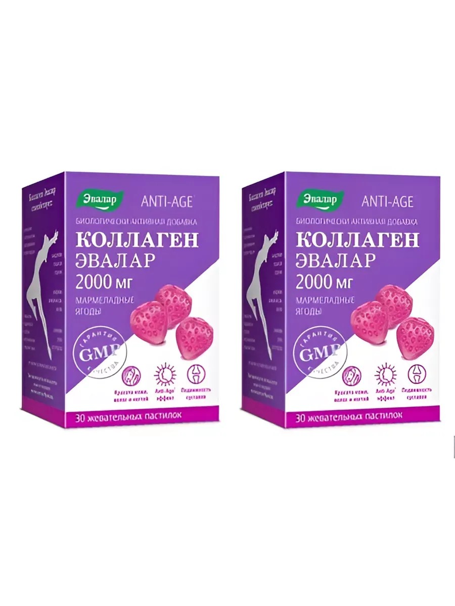 Действие:Для красоты кожи, волос, ногтей, замедления старения, подвижности суставов Содержание в 4 пастилках (суточном приеме):Коллаген, не менее 2000 мгВитамин С 60 мг 100% от рекомендуемого уровня суточного потребления (адекватного уровня)Пищевая ценность 1 жевательной пастилки: белки - 0,7 г, жиры - 0 г, углеводы - 2,5 г,энергетическая ценность (калорийность) - 54 кДж (13 ккал).Мармеладный коллаген от «Эвалар» для красоты и молодости изнутриКоллаген мармеладные ягоды Эвалар - уникальная форма гидролизованного коллагена с витамином С в виде вкусных мармеладных ягод. Пожалуй, самая удобная форма коллагена для приема внутрь для тех, кто устал глотать таблетки и капсулы или не любит все эти «танцы» с разведением порошка. Попробуйте мягкие жевательные пастилки с приятным фруктовым вкусом и при этом низкокалорийные!Коллаген мармеладные ягоды Эвалар способствует:• Улучшению состояния кожи, волос и ногтей; разглаживанию мелких морщин, повышению гладкости кожи, замедлению процессов старения (anti-age эффекту);• Повышению подвижности суставов, укреплению связок, уменьшению болевых ощущений, восстановлению хрящевой ткани;• Ускорению заживления ран и восстановлению соединительной ткани после травм, хирургического вмешательства, ожогов (улучшает регенерацию тканей);• Укреплению костной ткани, восстановлению костной ткани после переломов, снижению риска развития остеопороза.Коллаген мармеладные ягоды Эвалар - это:• Высокая биодоступность. Гидролизованный коллаген легко усваивается организмом: уже через 6 часов после приема до 95% гидролизованного коллагена обнаруживается в крови и в тканях по всему телу.• Оптимальная дозировка коллагена - 2000 мг.• Усиленный состав. Состав усилен витамином С, который стимулирует синтез собственного коллагена и гиалуроновой кислоты, обеспечивает антиоксидантную защиту.• Полезные и вкусные мармеладки. Если все время тянет на сладкое, Коллаген мармеладные ягоды - это полезная замена обычным конфетам, ведь в одной мармеладной ягоде всего 13 килокалорий! При этом они производятся в щадящем температурном режиме, который позволяет сохранить коллаген и витамин С максимально активными.• Коллагеновые пептиды без ГМО, лактозы, сои и глютена.