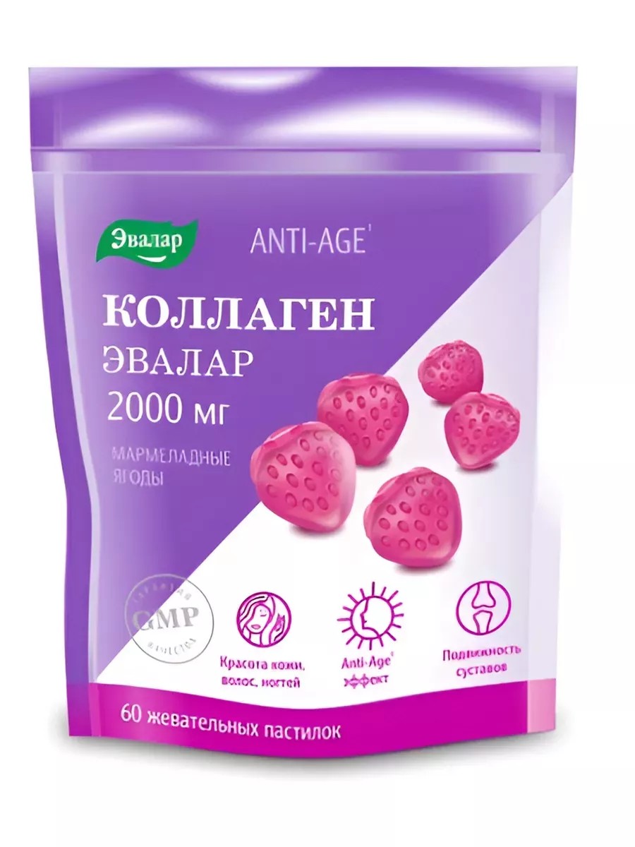 Коллаген мармеладные ягоды - Биологически активная добавка (БАД) к пище - жевательные пастилки с пептидами коллагенаАктивное вещество:Коллаген гидролизованный (пептиды), витамин СДействие:Для красоты кожи, волос, ногтей, замедления старения, подвижности суставовСодержание в 4 пастилках (суточном приеме):Коллаген, не менее 2000 мгВитамин С 60 мг 100% от рекомендуемого уровня суточного потребления (адекватного уровня)Пищевая ценность 1 жевательной пастилки: белки - 0,7 г, жиры - 0 г, углеводы - 2,5 г,энергетическая ценность (калорийность) - 54 кДж (13 ккал).Мармеладный коллаген от «Эвалар» для красоты и молодости изнутриКоллаген мармеладные ягоды Эвалар - уникальная форма гидролизованного коллагена с витамином С в виде вкусных мармеладных ягод. Пожалуй, самая удобная форма коллагена для приема внутрь для тех, кто устал глотать таблетки и капсулы или не любит все эти «танцы» с разведением порошка. Попробуйте мягкие жевательные пастилки с приятным фруктовым вкусом и при этом низкокалорийные!Коллаген мармеладные ягоды Эвалар способствует:• Улучшению состояния кожи, волос и ногтей; разглаживанию мелких морщин, повышению гладкости кожи, замедлению процессов старения (anti-age эффекту);• Повышению подвижности суставов, укреплению связок, уменьшению болевых ощущений, восстановлению хрящевой ткани;• Ускорению заживления ран и восстановлению соединительной ткани после травм, хирургического вмешательства, ожогов (улучшает регенерацию тканей);• Укреплению костной ткани, восстановлению костной ткани после переломов, снижению риска развития остеопороза.Коллаген мармеладные ягоды Эвалар - это:• Высокая биодоступность. Гидролизованный коллаген легко усваивается организмом: уже через 6 часов после приема до 95% гидролизованного коллагена обнаруживается в крови и в тканях по всему телу.• Оптимальная дозировка коллагена - 2000 мг.• Усиленный состав. Состав усилен витамином С, который стимулирует синтез собственного коллагена и гиалуроновой кислоты, обеспечивает антиоксидантную защиту.• Полезные и вкусные мармеладки. Если все время тянет на сладкое, Коллаген мармеладные ягоды - это полезная замена обычным конфетам, ведь в одной мармеладной ягоде всего 13 килокалорий! При этом они производятся в щадящем температурном режиме, который позволяет сохранить коллаген и витамин С максимально активными.• Коллагеновые пептиды без ГМО, лактозы, сои и глютена.