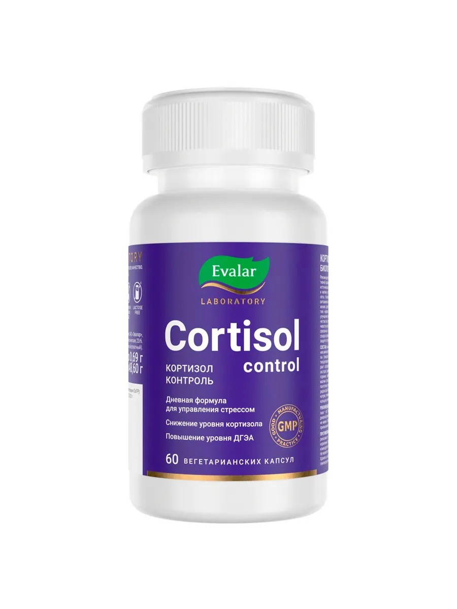 Кортизол контроль от Evalar Laboratory -это запатентованный комплекс активных растительных экстрактов для дневного приема.Кортизол контроль от Evalar Laboratory - это научно-обоснованное сочетание натуральных компонентов для управления стрессом в течении напряженного рабочего дня. Компоненты производятся из сырья, импортированного из Швейцарии, Германии, Великобритании и Испании. В составе Кортизол контроль от Evalar Laboratory содержатся вещества необходимые для снятия нервного напряжения, которые не вызывают привыкания даже при длительном приёме.В состав Кортизол контроль от Evalar Laboratory добавлен уникальный компонент фосфатидилсерин- главный кислотный фосфолипид мозга. Наряду с другими фосфолипидами составляет структуру клеточных мембран. Фосфатидилсерин улучшает клеточную коммуникацию и метаболизм, оказывая влияние на текучесть клеточных мембран, способствует более быстрому восстановлению организма после нагрузок за счет снижения уровня кортизола, замедляет потерю памяти.L-теанин добавлен в состав препарата Кортизол контроль от Evalar Laboratory тормозит синтез гормона стресса кортизола, помогает его разрушению. Снижает уровень тревоги, настороженности, раздражительности, освобождает от беспокойства и беспорядочных мыслей. Дает ясность ума и спокойствия.Витамины группы В дополняют комплекс усиляя эффект воздействия всех компонентов, а также выполняют ключевую роль в клеточном метаболизме, нормализуют работу центральной нервной системы, щитовидной железы, надпочечников.