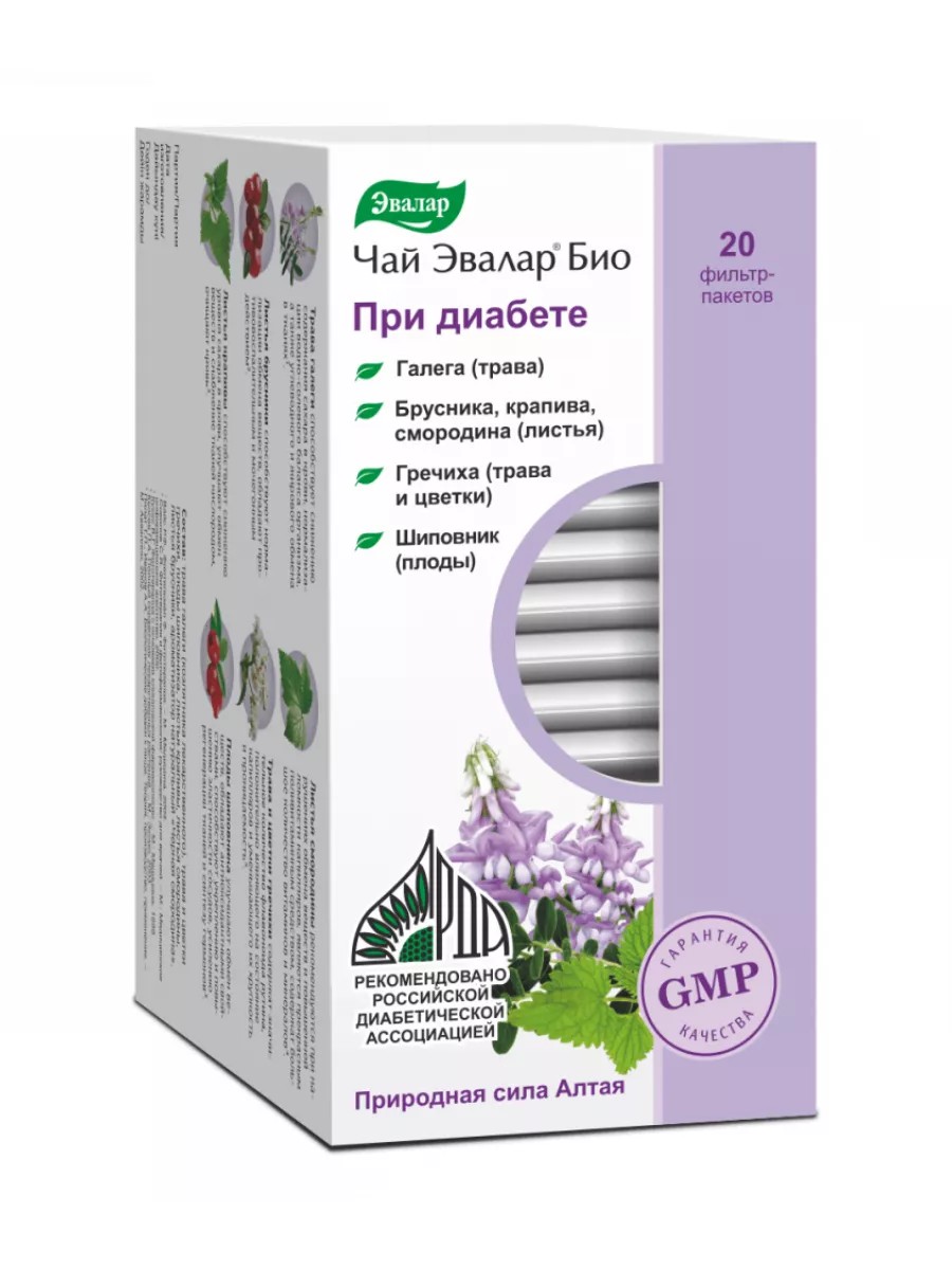 Чай Эвалар БИО при диабете На основе галеги лекарственной, которая способствует снижению уровня глюкозы и холестерина в крови. 2 фильтр-пакета в день обеспечивают не менее 30 мг флавоноидов в пересчете на рутин и не менее 8 мг арбутина, что составляет 100 % от адекватного уровня потребления каждого. входящих компонентов: Плоды шиповника обладают разнообразной фармакологической активностью, обусловленной в основном действием аскорбиновой кислоты, которая принимает непосредственное участие в окислительно-восстановительных процессах, повышает устойчивость и защитные реакции организма к инфекциям и другим неблагоприятным факторам внешней среды, стимулирует кроветворный аппарат, усиливает фагоцитарную способность лейкоцитов. Трава галегилекарственной (козлятник лекарственный) содержит алкалоид галегин. При лечении диабета галегин применяют как дополнительное средство к лечению инсулином. Галегин снижает уровень глюкозы в крови, за счет нормализации деятельности печени снижается уровень холестерина в крови. Помогая работать выделительной системе организма, галегин способствует нормализации водно-солевого баланса организма, углеводного и жирового обмена в тканях. Синергическое действие экстрактов растений, входящих в сборы вместе с галегой, дают организму диабетика возможность эффективно бороться с воспалениями, снижают жар, оказывают мягкое мочегонное и слабительное воздействие. Трава галеги оказывает мочегонное, потогонное, гипогликемическое действие, увеличивает содержание гликогена в печени и толерантность к глюкозе, ингибирует почечную инсулиназу. Листья брусники оказывают дезинфицирующее, мочегонное и желчегонное действия, тем самым ускоряют выведение из организма глюкозы и нерастворимых солей. Отвар и настой листьев брусники используют при отеках, вызывает снижение уровня сахара в крови, это может быть использовано при лечении диабета. Трава и цветки гречихи - применяются при гипо- и авитаминозах Р, в качестве средства, уменьшающего хрупкость и проницаемость капилляров, применяется для профилактики наклонности к кровоизлияниям в сетчатку глаза. Гречиха оказывает благотворное действие при нарушениях кровообращениях, спазмах сосудах и отеках. Листья смородины черной обладают сильным потогонным, мочегонным и противовоспалительным действием, являются прекрасным поливитаминным средством, рекомендуются при повышенной ломкости капилляров, нарушениях об-мена веществ. Листья крапивы улучшают обмен веществ, повышают сопротивляемость организма, могут быть использованы как противодиабетическое средство благодаря наличию в ней секретина, который стимулирует образование инсулина. Крапива очищает кровь и обладает желчегонным и мочегонным действием, усиливает основной обмен, оказывает противовоспалительное и некоторое гипогликемизирующее действие, улучшает снабжение тканей кислородом.