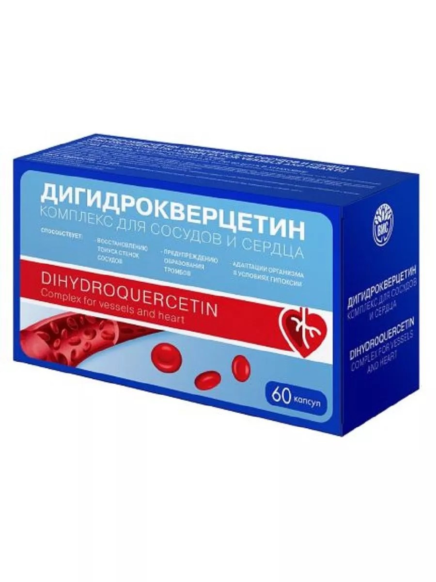 ДИГИДРОКВЕРЦЕТИН КОМПЛЕКС ДЛЯ СОСУДОВ И СЕРДЦА N60 КАПС ПО 0,33ГДИГИДРОКВЕРЦЕТИН КОМПЛЕКС ДЛЯ СОСУДОВ И СЕРДЦА (Dihydrоquerсetin Соmрlex fоr vessels and heart) - Биологически активная добавка (БАД) к пищеБиологически активная добавка (БАД) к пищеДигидрокверцетин способствует:- «созреванию» коллагена (в синергизме с аскорбиновой кислотой) и поддержке прочности, эластичности сосудистой стенки;- поддержке функций иммунной системы;- восстановлению после перенесенных вирусных инфекций;- защите клеток сердца и сосудов от преждевременного старения;- поддержке органов дыхания, в том числе при кашле «курильщика»;- поддержке мозгового кровообращения, улучшению памяти, внимания, умственной работоспособности;- поддержке микроциркуляции, снижению проницаемости капилляров и уменьшению их ломкости, поддержке отеках, тяжести в ногах;- поддержке функционального состояния сердечно-сосудистой системы, предотвращению скачков артериального давления, поддержке при реабилитации после инфаркта и инсульта;- снижению уровня «плохого» холестерина.СоставМикрокристаллическая целлюлоза (носитель), оболочка капсулы (желатин, с добавлением красителей: (титана диоксид), дигидрокверцетин, магния оксид (Е530, агент антислеживающий), кальция стеарат (Е470, агент антислеживающий).Способ применения и дозыВзрослым по 1 капсуле 1- 2 раза в день во время еды. Продолжительность приема: 30 дней. При необходимости курс можно повторить.ПротивопоказанияИндивидуальная непереносимость компонентов, беременность, кормление грудью. Перед применением рекомендуется проконсультироваться с врачом.Меры предосторожностиНет.Показания к применениюСпособствует поддержанию функционального состояния сердечно-сосудистой системы, восстановлению тонуса стенок сосудов и улучшению микроциркуляции крови, препятствует образованию тромбов. Обладает выраженными антиоксидантными свойствами, способствует защите клеток от негативного влияния свободных радикалов. Способствует адаптации организма в условиях гипоксии.
