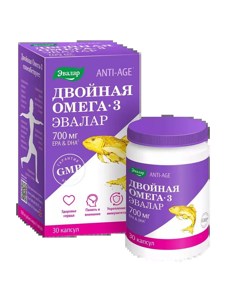 Регулярный прием капсул Двойная Омега-3 Эвалар помогает укрепить сердечно-сосудистую систему, улучшить кровообращение, обеспечить поддержание нормального уровня холестерина в крови, а также поддержать зрение, здоровье суставов, работу иммунной системы, нервной системы и мозга. Препарат разрешен беременным и кормящим женщинам. ДВОЙНАЯ ОМЕГА-3 700 МГ от компании Эвалар - это омега фармацевтического качества с высокой дозировкой омега-3 (700 мг в 1 капсуле/1400 в суточной дозировке (в 2-х капсулах)), для производства которой используется сырье высочайшего качества от ведущих мировых производителей с исключительно высокой степенью очистки.