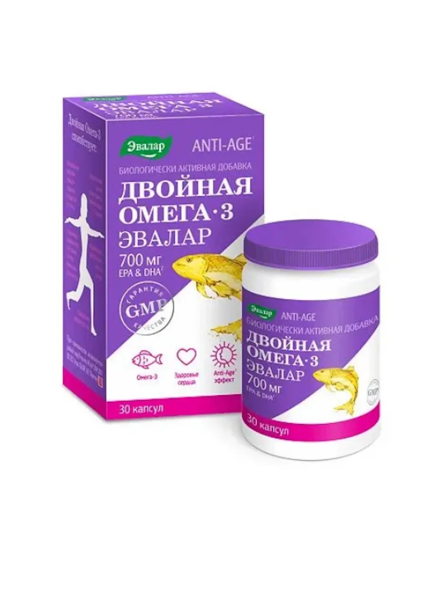 Двойная Омега-3 Эвалар -это:- Высокая дозировка омега-3 в одной капсуле (700 мг), и самая высокая дозировка омега-3 в суточном приеме (1400 в 2 капсулах).- Качественное сырье из Норвегии. Эвалар использует рыбий жир высочайшего качества от компании с мировым именем BASF (Норвегия).- Высокая чистота омега-3. Исключительно высокая степень очистки омега-3 превышает требования даже европейской фармакопеи.- Двойная Омега-3 Эвалар рекомендуется для поддержания:- уровня холестерина в норме- здоровья суставов- здоровья глаз- укреплению иммунитета- когнитивных функций в пожилом возрасте- памяти, внимания, способности к обучению- красоты кожи, волос, ногтей - здоровья сердца и сердечно-сосудистой системы- Разрешена беременным и кормящим женщинам.