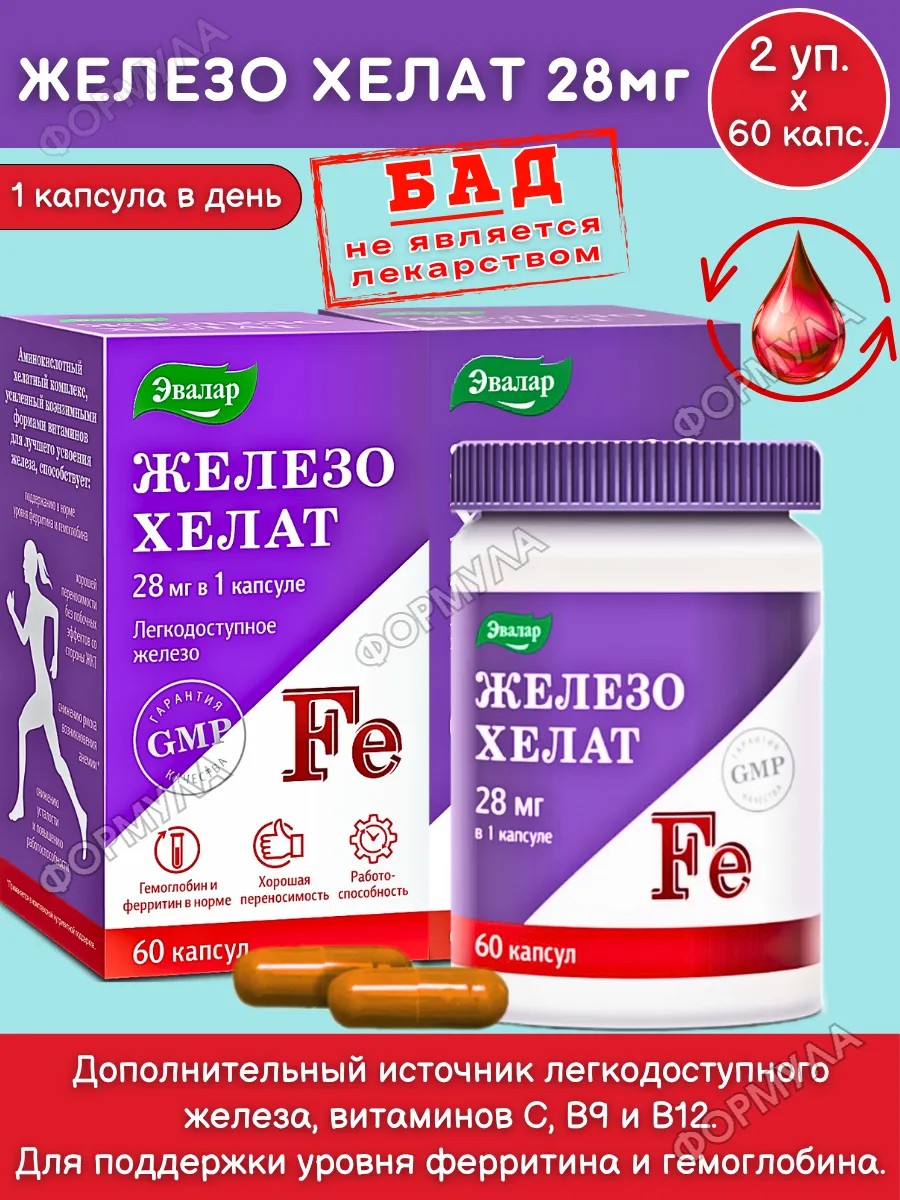 БАД Железо хелат Эвалар комплекс 60 капсул легкодоступное железо бисглицинат + коэнзимные витамины С В9 В12 - поддержка гемоглобина и ферритина, работоспособности, от усталости.